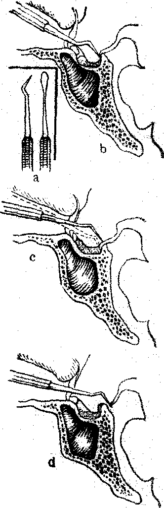 Stookey及Scarff第三脑室造瘘术改良法 a. 剥离子的形态 b. 剥离子经交叉池和终板插入第三脑室,其尖端触及鞍背c.剥离子尖端向上移动,触及鞍背顶点 d.剥离子经鞍背顶点上方穿破第三脑室底部,进入脚间池 第三脑室造瘘解除脑积水的有效率约为50%左右。因有些阻塞性脑积水病例的蛛网膜下腔由于长期缺乏脑脊液被闭塞,或有颅底蛛网膜粘连。脑积水病例的第三脑室底部神经组织多发生萎缩,术后除少数有高热外,大多无下丘脑症状。亦有切开大脑皮质 (右侧额中回,顶枕区皮质) 作脑室造瘘者,由于手术对脑功能损害较大,局部无扩大脑池等原因疗效较差。 ☚ 脑室引流装置 脉络丛切除术 ☛ |