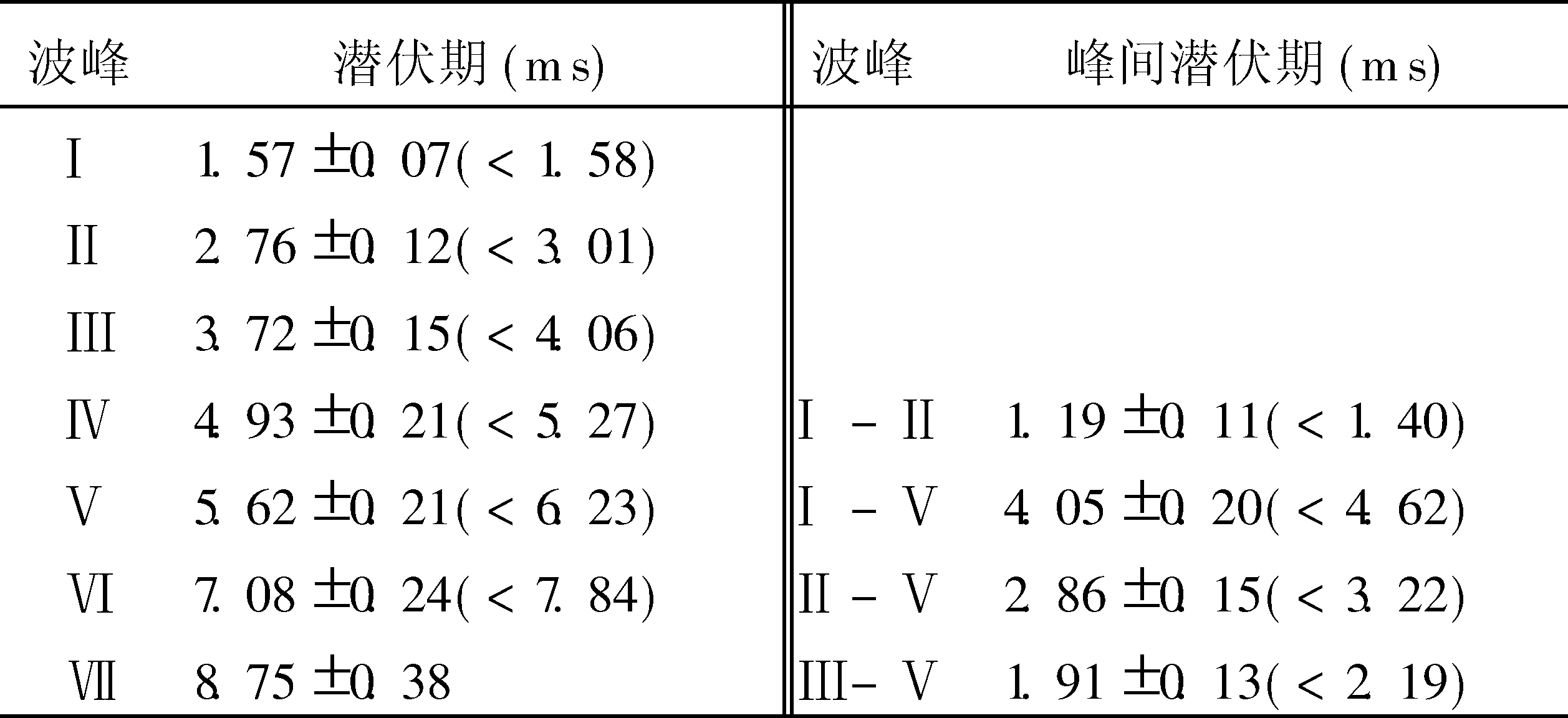 听性脑干反应在神经学称为脑干听觉诱发电位。为目前临床常用的诱发电位检查方法。Fujita M等测定的正常值参见下表。