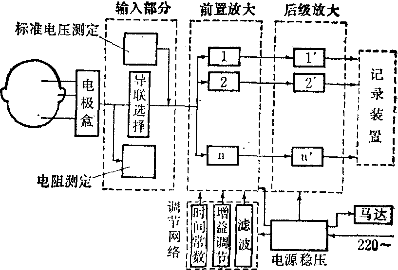 图3 应用微机的脑诱发电位平均迭加仪结构方框图 波器上,也可用记录仪描记。数字式仪器分辨率高,使用方便。脑电图分析 脑电图分析有时间波形分析和频率波形分析两类。 (1) 时间波形分析: 又称时域法。使用电子仪器的脑电波自动分析仪有: ❶带通滤波分析仪:让脑波通过若干组(如5组)不同频率的滤波器,对特定频率进行描记,并产生不同频带在5s或10s内的累积分析。缺点是稳定性较差; ❷零点交叉分析仪: 用波形过零次数来求脑波周期。缺点是波幅信息丢失; ❸平均波幅分析仪:取出脑电波的平均值变化作分析; ❹相关分析仪:研究脑波规律性和两组脑波间的相关过程。后两种结构较复杂。 (2)频率波形分析: 又称频域法。将8~16通道脑电波加以数字化,送入计算机系统进行快速傅里叶变换,其结果经加权迭加而平滑化,描记出来的频谱图可用来分析脑波中各频率成分的数量特性。频域法是脑电波分析的重要手段。 除上述分析法外,最新的技术是模式识别分析。该技术是利用电子计算机进行波形参数的线性估计,用最小二乘法识别出波形的模式,实现全自动计算机脑电检测。 ☚ 体表电位图 肌电测量 ☛ |