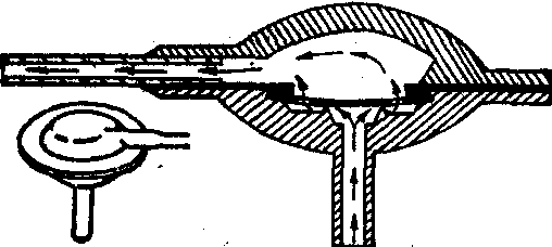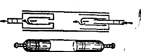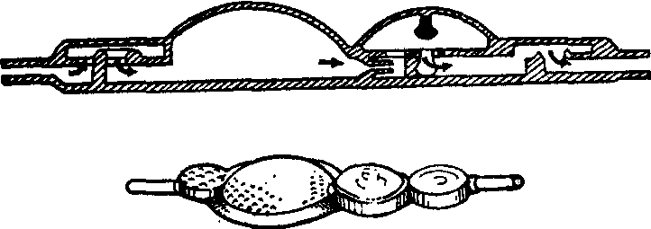 图2 Pudenz管 (1) Pudenz型 (图2): 阀门装置为扁圆形硅橡胶制成,体积小无异物感。按压阀门盖有泵吸作用,阀门中的薄膜,有单向引流,节制流量的作用。有双膜阀门者可以冲洗脑室及腹腔管。脑室管端含有金属钽粉有X线显影作用,心房管及腹腔管有四条裂隙阀门,涂有二硫化钼有抗凝血及抗粘结作用。接头为尼龙制成。但有脑脊液蛋白过高时,使阀门粘连,导致阻塞的缺点。脑室压过低时,阀盖凹陷,长时间的凹陷也可引起阻塞。 (2) Hakim型(图3):阀门装置为不锈钢球及弹簧制双阀,外形和Holter型相似。脑室管为Portnoy型,心房或腹腔管端有裂隙阀 (内径1.2mm)。缺点为弹簧可由于蛋白粘连而失效。 (3) Denver型 (图4): 阀门装置为硅橡胶制成的裂隙单阀,心房及腹腔端也有裂隙单阀,结构简单。脑室管内径1.6mm,心房腹腔管内径1.2mm。 (4) Ames型 (图5): 用双室装置代替中间阀门,心房及腹腔管端有裂隙阀门,装置也很简单。 (5) 多功能型 (图6): 由抗虹吸装置及开关阀组成。立位时有防止颅内低压作用,开关阀可以闭锁阀门停止使用,或检查脑室管,心房管阻塞用。也可作药物注射用。本装置可以接在Pudenz型上增加效能。脑室管,心房管与Pudenz型相同。缺点为装置太大,婴儿不适用。