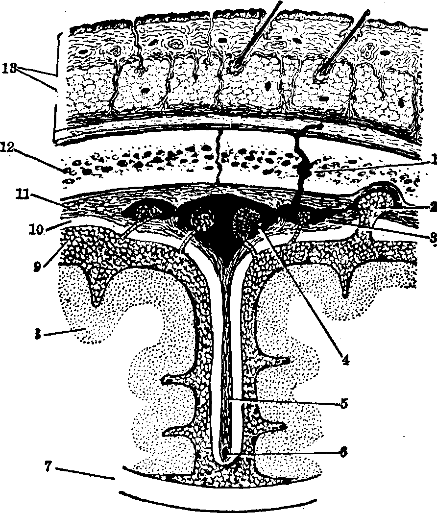 | 释义 | 脑脊膜meninges动物固定和保护中枢神经系统的结缔组织膜。分外层硬膜,中层蛛网膜和内层软膜3层。在蛛网膜与软膜之间的空腔有透明的脑脊液,司防御震荡和物质交换的媒介作用,并可使脑与脊髓的压力保持均衡。 脑脊膜 脑脊膜naojimo被覆在脑和脊髓外面的结缔组织膜。共有三层,由外向内依次为硬膜、珠网膜和软膜。三层膜在脑和脊髓互相连续。包在脊髓外面的三层膜分别称为硬脊膜、珠网膜、和软脊膜;而包在脑外面的三层膜分别称为硬脑膜、珠网膜和软脑膜。硬膜厚而坚韧,可保护脑、脊髓,并防止细菌侵入。珠网膜,是一层由结缔组织构成无血管的透明薄膜。软膜很薄,具有丰富的血管,紧贴在脑和脊髓的表面,不易分离。在三层膜之间形成三个腔隙。在硬膜与颅腔、椎管之间的腔隙为硬膜外腔; 在硬膜与珠网膜之间的腔隙为硬膜下腔;珠网膜与软膜之间的腔隙为珠网膜下腔,此腔内含有大量透明的脑脊液。在脊髓末端的蛛网膜下腔较为扩大,临床抽取病人的脑脊液或向脑脊液里注入药物时,常在此处作腰椎穿刺。脑脊膜的功能在于保护和支持脑和脊髓。 ☚ 血脑屏障 脑室、脑脊液 ☛ 脑脊膜自外向内由三层结缔组织构成的膜。外层硬脊膜最坚韧,有防止感染和损伤的作用。它与椎管间构成硬膜外腔,临床上硬脊膜外腔麻醉即注入此腔,以阻滞脊神经根;中层蛛网膜,其下为蛛网膜下腔,充满脑脊液,腰椎穿刺和腰麻即经此腔进行;内层软脊膜,紧包脊髓,含有血管和神经。 脑脊膜 脑脊膜脑和脊髓的表面被覆着由结缔组织构成的被膜,称为脑脊膜,有保护、支持、营养脑和脊髓的功能。脑脊膜共有三层,由外向内分别称为硬膜、蛛网膜和软膜,各有其结构特点和功能意义。