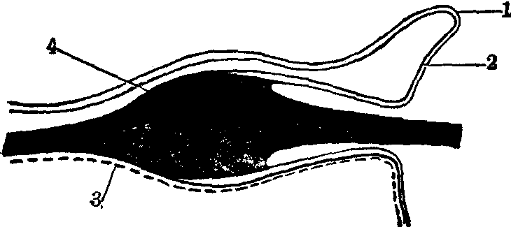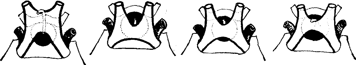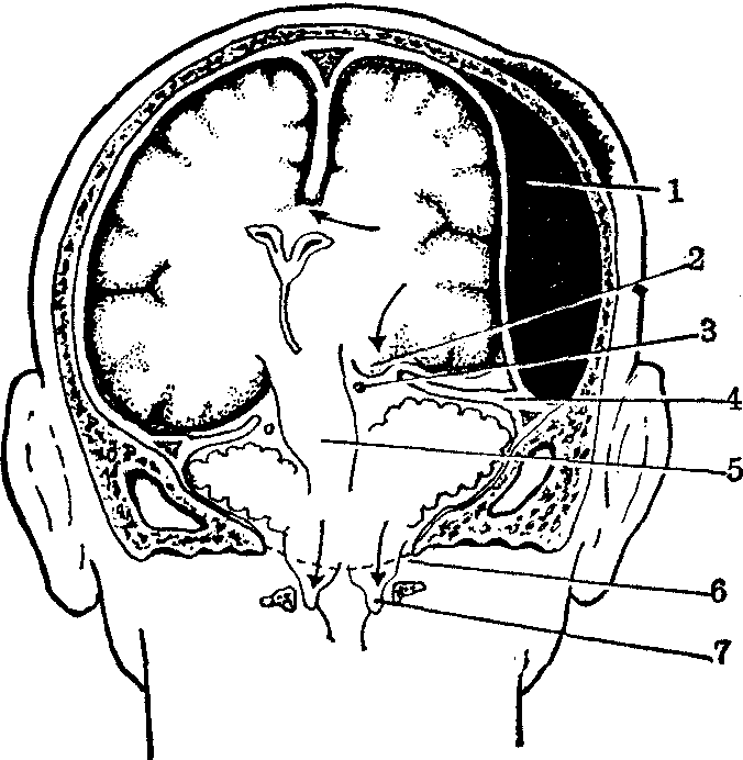 图3 小脑幕切迹疝和枕骨大孔疝 1.硬膜外血肿 2.海马旁回钩 3.动眼神经 4.小脑幕 5.中脑 6. 枕骨大孔 7. 小脑扁桃体运动障碍和动眼神经损伤症状。小脑镰居正中矢状位,位于小脑两半球后部之间,自小脑幕下面沿着枕内嵴向下延伸至枕骨大孔。 (3) 鞍膈: 是覆盖在蝶鞍上方的呈水平位置的硬膜板。附着在前、后床突之间,中间有小孔,供垂体柄通过。 硬脑膜富含血管神经,对内外界环境的变化反应敏感,这一特点常是引起血管性头痛的物质基础。硬脑膜动脉主要有来自颌内动脉的脑膜中动脉、眼动脉的脑膜前动脉以及枕动脉和椎动脉的脑膜后支。硬脑膜的感觉神经: 在小脑幕以上,接受三叉神经的分支分布;在小脑幕以下,接受来自迷走神经和上部颈神经的分支。神经分支主要位于硬膜的脑膜层内,构成许多神经末梢,能对颅内压的轻微变化引起敏感反应。血管运动神经来自交感神经组成的动脉丛。 硬脑膜与某些脑神经的关系,亦具有临床意义。当脑神经穿经颅底孔道时,都不同程度为硬脑膜所被覆。其中特别是动眼神经、滑车神经和展神经在颅内的行程较长,行经硬脑膜所形成的海绵窦,如海绵窦血栓形成则可侵及这些神经。另外,视交叉与鞍膈可有不同的位置关系,视交叉可位于鞍膈上方的前分、中分或后分,因此垂体柄与视交叉位置长短不等(图4)。在垂体发生肿瘤时,可压迫视交叉的不同部位,而引起视觉的不同障碍。 当三叉神经根向前行于颅中窝底硬脑膜下时,硬脑膜和蛛网膜呈套状包绕着三叉神经根和节,形成三叉神经腔,又名三叉神经池(图5)。此腔与脑桥池的外侧分相通。临床上可以根据这些结构特点,将某些麻醉药物经卵圆孔注入此腔内,药物即随神经分支扩散,以达到阻滞麻醉的目的。但因此腔可与脑桥池的外侧分相通,注入麻醉药物过多时,药物可循此途径达到蛛网膜下腔,从而波及其他神经或脑干本身而引起种种严重症状,如眼肌麻痹、眼球震颤、重听、耳聋、晕眩、呕吐及面肌麻痹等。 脑蛛网膜 脑蛛网膜简称蛛膜,位于硬脑膜与软脑膜之间,是一层不含血管并带有光泽的膜。它与硬脑膜之间存在一个狭窄空隙,称为硬膜下隙,内有少量浆液。蛛膜内面借结缔组织小梁与软脑膜相连,其间即为蛛网膜下腔,腔内充满脑脊液。脑蛛网膜仅跨越脑回表面,而不深入脑的沟裂之内。因此在跨越脑的裂或窝处即形成一些较大和较深的蛛网膜下池。其中最大的是位于小脑与延髓之间的小脑延髓池(又称大池),是临床上常用的穿刺部位,另外还有脑桥池、脚间池、交叉池和上池等。上池围绕中脑的后面、上面和外侧面,临床上称为环池。此池内有大脑静脉以及大脑后动脉和小脑上动脉等。上述这些池均可用气脑造影术予以显示。 软脑膜 软脑膜为最内层,紧贴脑实质表面,深入脑的沟裂之内,并随血管深入脑的实质。软脑膜可分内、外两层: 内层是真正的软膜,由纤细的网状纤维和弹性纤维组成;外层由随蛛膜小梁延续而来的胶元纤维组成,但此层在脑部并不一定存在(在脊髓则参予构成齿状韧带)。 (1) 脉络丛: 脉络丛见于侧脑室、第三脑室和第四脑室内,由软膜、血管与室管膜上皮共同形成的脉络组织突入脑室内而构成。脉络丛有分泌脑脊液等功能。