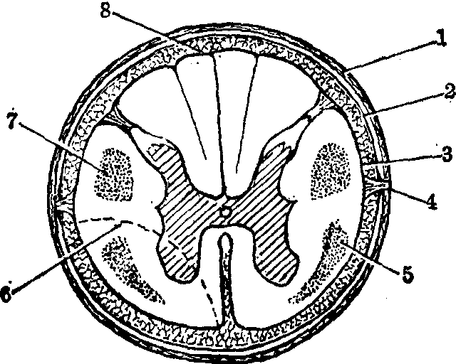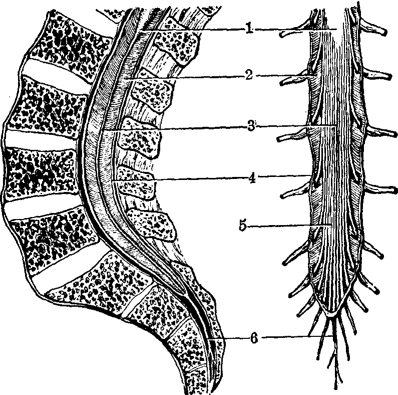 图7 脊髓末端和终池的位置 相通,内充满脑脊液。由于脊髓末端仅至第1腰椎下缘或第2腰椎上缘平面,所以自脊髓末端至第2骶椎平面之间只有脊神经根浸泡在脑脊液中,故此处称为终池(图7)。临床上常在第3~4腰椎棘突之间进行穿刺,以抽取脑脊液或注入药物,而不会伤及脊髓实质。 ☚ 侧脑室 脑脊液的产生及循环 ☛ 脑脊膜 脑脊膜脑和脊髓外包具保护作用的结缔组织膜,称脑脊膜。由外向内,脑脊膜分三层,即硬膜、蛛网膜和软膜。硬膜也称脑脊硬膜,较厚,坚实而致密。脊髓硬膜与椎骨骨膜不贴连,二者之间为硬膜外腔,腔内含疏松结缔组织、脂肪组织和静脉丛。脑硬膜在胚胎期不与颅骨骨膜相贴,成年时两膜紧贴一起,只在折成大脑镰和大静脉窦存在处分开。外层是骨膜,结构较疏松并含许多血管; 内层较薄,结构致密,称固有硬膜。脑和脊髓的蛛网膜基本相同,为薄膜,不含血管,外面较平滑,内面伸出许多丝络状的蛛网膜小梁,与软膜相连。因两膜关系密切,且构造相似,常合称软脑脊膜或软-蛛网膜。这两膜间有蛛网膜下腔,内含脑脊液。硬膜和软膜有丰富的神经。硬膜除有支配血管的神经外,并有许多感觉神经末梢。软膜和脉络丛的血管周围有丰富的神经丛,大多属交感神经。血管外膜有游离感觉神经末梢,有时并见散在的神经细胞。硬膜 此膜主要为密集成层的胶原纤维束组成,也含弹性纤维。纤维束间有成纤维细胞、血管、淋巴管和神经。硬膜内面衬贴几层着色较深的扁平细胞,彼此由闭锁连接和粘着连接相连。这些细胞源于间充质,与间皮相似。但也有人认为它们与间皮的性质不同,称它们为硬膜下神经上皮,并认为它们与周围神经的神经束上皮相连(参见“神经”条)。 ☚ 脉络丛 血液 ☛ |