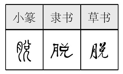 【提示】月中间的两横,宋体与左右两边相接,楷体与左边相接,与右边相离。 *脱tuō11画 月部 (1) 肉去掉皮骨;泛指附着的东西掉下: ~骨肉|~发(fà)|~皮|~落。 (2) 除去;消除: ~衣|~鞋|~贫|~脂棉。 (3) 离开: ~钩|~产|~险。 (4) 漏掉(文字): ~漏|~误。 脱 ☚ 胄 脀 ☛ 脱tuō小篆以来的形声字。从月(肉),兑声。韵变如妥绥、随椭、垂唾例。本指消瘦义。北京等地有“掉肉(指消瘦)”的话,意同。引申指离开,落掉。如:脱皮|脱节|脱逃|走脱。转义指遗漏(文字)。如:脱误|中间脱去了几个字。组词如:脱掉|脱漏|脱离。引申为取下,去掉。如:脱衣裳|脱帽。又引申组词如:通脱|洒脱。 脱★常◎常