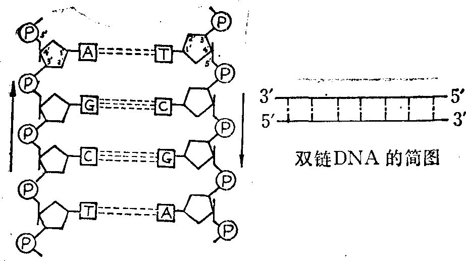 ⓒ+代表糖环中的碳 DNA双螺旋结构除碱基成对特点外,还有以下几个要点: ❶两条互补链是以相对方向缠绕在一起的,即一个是3′→5′多核苷酸,另一个则是5′→3′多核苷酸,如图2,左方为结构图,右方为简化图。 ❷由于碱基在双螺旋的中心,而磷酸基团在螺旋外部,故DNA一般是呈酸性的常以盐的形式存在。 ❸螺旋每绕一周恰好是10对核苷酸,每绕一周的旋距是34A(3.4nm)。亦即在每对核苷酸旋转时都是转36°,占一个螺距的1/10。长为3.4A,DNA双螺旋的直径则是20。 从螺距和直径两个数据看, 计算DNA纤维长度时如设一个DNA分子中有3×106个核苷酸对,则其DNA双螺旋长度应为3×106×3.4,即为1.02mm,而螺旋的直径还是20A,这长度为直径的5.1×105倍,是个极长的链,在生物界中大肠杆菌中的基因DNA的长度就是如此,不过它常盘绕成超螺旋包在大肠杆菌细胞中。另外,如果只从碱基对比来看也会发现A与T和G与C的克分子比常常并非完全相同,这也是由于DNA分子很大,提纯困难,加上实验的误差等等,所以得到的数字有时不可能完全一致。从这点也可说明生物体的DNA都是以大分子状态存在,一般分子量在106以上,甚至108以上。这样比起一般生物体中所含的有机物质就大得多了。但从其化学组成来说,不论多大分子都是由上述常见的四种核苷酸所组成。所以在说明是哪一种DNA时,必须前面加上生物体名称和组织或器官的名称等等,如小牛胸腺DNA。