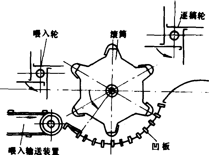 图4 叶轮式脱粒装置 1.喂入口;2.脱粒叶轮;3.凹板筛;4.推送滚筒;5.滚筒刀片; 6.外壳 手持式弓齿滚筒脱粒装置 用手握持禾把进行脱粒的半喂入脱粒装置。其弓齿式脱粒元件对作物起梳刷作用辅以冲击而脱下籽粒,适用于茎秆整齐、穗头一致的稻麦类作物。 人力打稻机上的脱粒装置只有一个脱粒滚筒,没有凹板配合作用。弓齿或板刀齿按螺旋线排列在滚筒表面。滚筒分开式和闭式两种。在稻麦两用的机动打稻机上,为了适应小麦容易出现断穗的脱粒特性,加强断穗处理能力,常在滚筒的前方装一块斜挡板,使它能返回脱粒间隙进行复脱。滚筒的下方装编织筛式凹板。 夹持式弓齿滚筒脱粒装置 由夹持输送器夹紧作物茎秆基部边输送边脱粒的半喂入脱粒装置。适用于脱水稻和麦类作物,广泛应用在半喂入的脱粒机和联合收割机上。脱粒装置由夹持输送器、弓齿滚筒、凹板和副滚筒组成。夹持输送器由链条和夹持台组成。滚筒(图5)表面装有按螺旋线排列的弓齿。弓齿分脱粒齿、加强齿、第一梳整齿、第二械整齿、第三梳整齿和内齿,滚筒的喂入口一端,由一段截锥体和圆柱体相连接,截锥体上固定着强度较大的梳整齿,圆柱体上装有加强齿和脱粒齿,出口端装有击禾板,促使碎草迅速排出脱粒室。闭式滚筒配编织筛式凹板,开式滚筒配栅格凹板。滚筒盖内侧装有导向板。副滚筒上的弓齿矮而粗壮。
