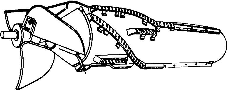 图1 脱粒装置部件组成示意图 脱粒装置按喂入方式分为全喂入和半喂入两大类。全喂入是将带穗茎秆全部喂入脱粒装置,它不仅适用于脱稻麦类谷物,而且适用于脱其他农作物,生产效率高。但脱粒后不能保留完整茎秆,能耗高。半喂入是只将包含穗头部分的作物上部喂入脱粒装置,它主要用于脱稻麦,脱粒后的茎秆整齐完整,能耗低。按作物在脱粒装置内的流动方向分为切流型和轴流型。切流型脱粒装置工作时,作物被滚筒抓取后,沿滚筒的切线方向运动。轴流型脱粒装置工作时,作物既沿滚筒的切向运动,同时又沿滚筒轴向移动,其合成的运动轨迹为螺旋线。在全喂入脱粒装置中,脱粒部件的结构形式有滚筒式和叶轮式两种,绝大多数脱粒机和谷物联合收割机都采用滚筒式脱粒装置。按滚筒上脱粒元件的不同又有纹杆式、钉齿式和杆齿式。在半喂入脱粒装置中,脱粒部件的结构形式为滚筒式,滚筒上脱粒元件为弓齿。夹持作物茎秆基部的方式有手持式和夹持式。 切流型纹杆滚筒式脱粒装置 以纹杆作为脱粒元件进行脱粒的装置。脱粒适应性能广,工作性能稳定,生产率高,脱粒质量好,茎秆破碎少,制造容易,调整方便。主要用于脱麦类作物,是应用最广泛的一种传统型脱粒装置,但对水稻、豆类和潮湿作物的脱粒适应性略差。 工作时滚筒高速旋转,抓取由喂入轮送进的作物,在纹杆的强力冲击作用和凹板表面的揉搓摩擦作用下被脱下籽粒,脱粒后的茎秆由逐稿轮排出,籽粒中的70~90%由凹板筛孔分离出来。脱麦时的纹杆线速度达28~32米/秒,脱粒间隙进口为16~18毫米,出口为4毫米。 纹杆滚筒分开式和闭式两种。开式滚筒的纹杆与纹杆之间为空腔,抓取作物的能力强,作物可以纵向喂入或横向喂入。闭式滚筒的纹杆装在封闭的薄壁圆筒上,滚筒旋转时,周围形成的空气涡流小,能耗低,稿草脱离滚筒快。纹杆滚筒直径有400、450、550和600毫米;长度有500、700、900、1 100、1200、1 350和1 500毫米。纹杆分A型和D型,左右旋向。A型纹杆装在纹杆座上,D型纹杆直接装在滚筒的辐盘上。凹板为栅格形,它由横格板和筛条构成,筛孔长30~50毫米,孔宽8~15毫米;横隔板高出筛条5~15毫米,以阻滞作物通过脱粒间隙,充分发挥凹板工作面的脱粒及分离作用。 轴流型纹杆滚筒式脱粒装置 是20世纪70年代发展起来的一种新型结构,由纹杆滚筒及其外围的凹板与顶罩组成,凹板与顶罩形成一圆筒罩,顶罩上有导向板引导作物轴向流动。它分横向轴流式和纵向轴流式两种。横向轴流式的滚筒沿机器横向配置,作物被滚筒切向抓取后,沿导向板绕滚筒圆周作螺旋线运动。纵向轴流式的滚筒(图2)沿机器纵向配置。由3个螺旋桨或叶片组成的喂入轮固定在滚筒的前方,螺旋形的纹杆装在封闭的薄壁圆筒上。脱粒时,作物由喂入轮沿轴向喂入,并在滚筒外围作螺旋线纵向运动。由于轴流型纹杆滚筒大大提高了脱粒装置的分离能力,可以省掉结构庞大的逐稿器分离装置,因此它在谷物联合收割机上得到了应用。