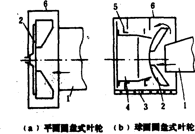图3 开式杆齿滚筒 1.辐盘; 2.轴承座; 3.滚筒轴; 4.中间辐盘; 5.杆齿;6.齿板 叶轮式脱粒装置 利用旋转叶轮进行脱粒的装置。适用于脱小麦、水稻、玉米、豆类等多种作物。工作时,作物从喂入口喂入,经高速旋转的脱粒叶轮叶片的冲击而脱粒。叶片外缘的圆周速度视作物种类而异,小麦28~34米/秒,玉米10~14米/秒,高粱25米/秒,水稻18~22米/秒,豆类18~22米/秒。脱粒过程中,叶轮具有吸风和鼓风作用。作物以从叶轮的轴向喂入(吸风),径向排出(鼓风)的方式而运动。图4表示了两种结构的叶轮。图4(a)为带4个叶片的平面圆盘式叶轮,它无分离能力,全部籽粒和茎秆相混,只作简易的脱粒装置用。图4(b)为带12个叶片的球面圆盘式叶轮,它有部分分离能力,茎秆中尚有籽粒,需进一步分离。叶轮式脱粒装置的结构简单、体积小、重量轻、能耗低。