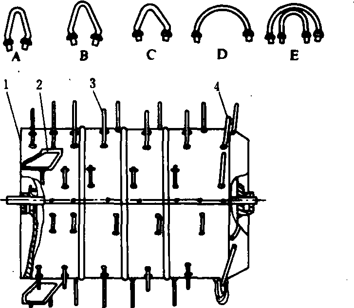 图5 弓齿滚筒 A.脱粒齿; B.加强齿; C.第一梳整齿; D.第二梳整齿;E.第三梳整齿;1.滚筒圈;2.击禾板; 3.脱粒齿; 4.梳整齿 根据不同种类的作物选择不同的脱粒速度。脱粳稻时14~15米/秒,脱小麦时17~18米/秒,脱留种用的作物时为上述脱粒速度的60%左右。脱粒机的夹持链线速度为0.25~0.35米/秒,联合收割机的则为0.5~1.0米/秒。 脱粒装置threshing device用来脱出谷穗中谷粒并将其分离出来的工作部件。按作物喂入方式可分为全喂入和半喂入两类。前者又可按作物在脱粒装置中的流向分为切流式和轴流式两种。常用的切流式脱粒装置有纹杆滚筒和钉齿滚筒;轴流式有圆柱型指杆式滚筒和圆锥形指杆式滚筒。半喂入脱粒装置多采用弓齿滚筒。 |