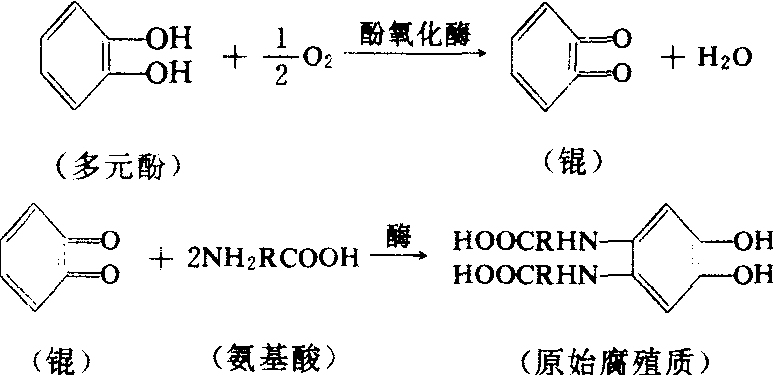 在土壤微生物分解有机质的同时,还进行着腐殖质的合成过程,称为腐殖质化作用。可分为两个阶段。❶微生物将有机残体分解,转化为较简单的有机化合物,其中包括形成腐殖质的组成成分,如芳香族化合物(多元酚)和含氮化合物(氨基酸或肽)。❷腐殖质组成物质经缩合而形成新的高分子化合物——原始腐殖质。其式为: