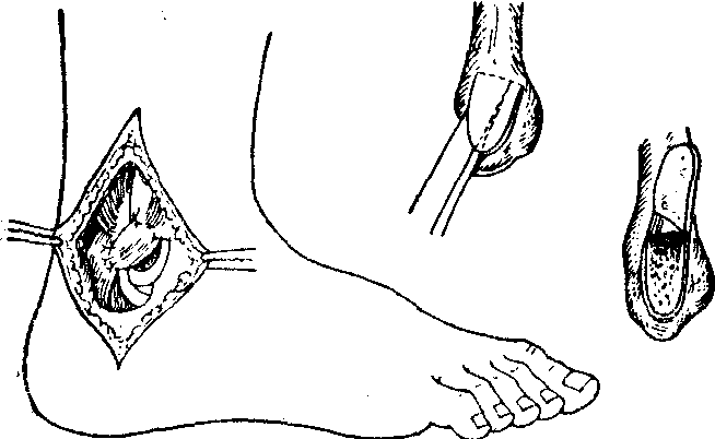 新伤应以石膏固定4~5周。慢性者应手术治疗。术式较多,Watson Jones法较好(见图1)。如用Ellis Jones法应予改良,腱应由腓骨沟穿入固定,而且不应拉得太紧,否则踝背伸受限,影响运动技术(见图2)。