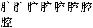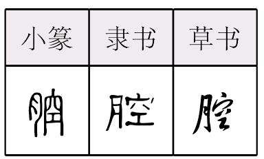腔 金文; 篆;《説文》新附qiāng[月(肉,肌體,意符)+空(意符)→腔(徐鉉:“腔,内空也。從肉,從空。空亦聲。”腔,動物體内空的部分〈體腔,胸腔,腹腔,口腔,喉腔等〉;樂曲的變化,説話的口音〈腔調〉,也指人的行爲和作風〈什麽腔調!〉。)] [清] 吴敬梓《儒林外史》(第十一回):“兩邊一副箋紙的聯,上寫著‘三間東倒西歪屋,一個南腔北調人。’” 腔腔qiāng(12画)