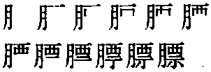 【提示】月,中间两横宋体与两边相接,楷体与左边相接,与右边相离。右下的示,起笔是横,不是点; 第四笔宋体是撇,楷体是撇点。 △膘〔臕〕biāo15画 月部 牲畜身上(有时也指人)的肥肉: 肥~|~肥体壮。 膘biāo上古形声字。从月(肉),票声。本指牛肋后下肢前与皮不可分剥处的肉。后指肥肉(多指牲畜)。如:膘满肉肥|上膘(长肉)。 |