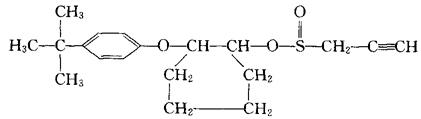 | 释义 | 克螨特 又称丙炔螨特。 有机硫广谱杀螨剂。化学名称:2-(4-特丁基苯氧基)环己基丙-2炔基亚硫酸酯。化学结构式如下。原药为黑色黏性液体,密度1.085~1.115, 20℃时蒸气压为400Pa。几乎不溶于水,易溶于多种有机溶剂,遇强酸、强碱分解,闪点28℃,易燃。具有触杀和胃毒作用,无内吸和渗透作用。 对成、若螨有效,对卵效果差。气温20℃以上药效可提高。 用于棉花、蔬菜、苹果、柑橘、茶、花卉等多种作物的害螨。对人、畜低毒,大鼠急性口服LD502200mg/kg,兔急性经皮LD503476mg/kg,大鼠急性吸入LC50为2.5mg/L。对眼、皮肤有刺激作用。对鱼类高毒,对蜜蜂低毒。