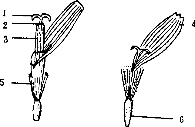 图22 舌状花1. 柱头 2. 花柱 3. 花药4. 花冠 5. 冠毛 6. 子房