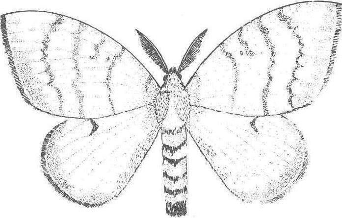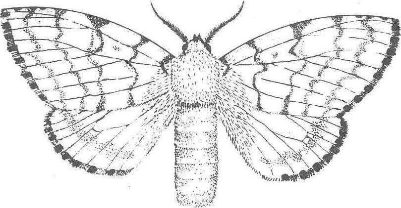 图2 舞毒蛾幼虫 开始在柞树上、落叶中或石块下化蛹,以7月上、中旬化蛹为多。6月底开始羽化,7月中下旬为羽化盛期。成虫有趋光性,羽化当天能交尾。卵产在树上、墙壁、石块等物体的背光处。一头雌蛾一般产一个卵块,少数产2个卵块,卵块上覆黄褐色绒毛。每个卵块有300~1250个卵粒。分布为害 舞毒蛾分布于中国黑龙江、吉林、辽宁、内蒙古、山东、山西、陕西、河南、河北、湖北、湖南、四川、贵州等省区。以中国北方柞蚕区受害较重。舞毒蛾幼虫大量摄食柞树叶片、嫩芽、嫩梢。1974~1976年辽宁省南部和东南部舞毒蛾大发生,有126万亩柞蚕场受到严重为害而不能养蚕,部分柞蚕场柞叶被舞毒蛾幼虫吃光,使柞蚕生产遭受不同程度的损失。有的柞蚕场因树叶严重受害,柞蚕饥饿大量死亡,由于剩下蚕数过少而被迫停放;有的柞蚕场虽然尚剩蚕数较多,但是收集的春蚕茧,皮薄质差、重量轻,不能作秋蚕用种。 天敌 国内外记载有200余种。在中国东北已经搜集到扑食性天敌13种,寄生性天敌26种。在辽宁省柞蚕区舞毒蛾的主要天敌有粗状六索线虫、舞毒蛾核型多角体病毒及质型病毒、舞毒蛾黑瘤姬蜂,四星埋葬虫、古毒蛾追寄蝇、毒蛾蜉寄蝇、皮蠹、梳胫饰腹寄蝇、柞蚕饰腹寄蝇、麻雀、杜鹃、大山雀等。 防治 卵期刮除卵块。成虫期用黑光灯诱杀,能消灭大量抱卵雌蛾。幼虫3龄前喷洒舞毒蛾核型多角体病毒悬浮液,将病毒虫尸加水稀释成3×66~3×107个多角体/毫升。或于幼虫2~4龄期喷洒50%辛硫磷乳油1,000倍液,80%敌敌畏乳油700倍液。或喷洒2%辛硫磷粉或2%辛敌混合粉,杀虫效果均很好。但在幼虫生长5、6龄期时进行防治,必须提高用药浓度,并且由于柞叶已经受虫为害损失较大,药剂防治必须过了残毒期才能放养柞蚕。 舞毒蛾gypsy mothLymantriadispar L. ,鳞翅目,毒蛾科。分布于黑龙江、吉林、辽宁、内蒙古、陕西、宁夏、江苏、山东、河北、湖南等省区;朝鲜、韩国、日本及欧洲也有分布。雌蛾体长28 mm,前翅黄白色,有褐色弯曲斑纹4条,外缘有黑色纹1列;雄蛾体长约18 mm,前翅灰褐色,有褐色弯曲斑纹。幼虫体色多变:黑、灰、黄色;具暗色纵条,全身毛瘤排成6纵列;末龄幼虫体长50~70 mm,背面前5对毛瘤蓝色,后7对红色。年生1代。幼虫食叶,食性很杂。为世界性大害虫。以刮除卵块;灯光诱杀成虫;喷洒生物或化学农药毒杀幼虫为主要防治措施。 舞毒蛾鳞翅目毒蛾科,又名吉普赛蛾。雌蛾体长25毫米,翅展60—90毫米。触角双栉齿状,较雄者细而长。前后翅灰白色。前翅具有5道横行波纹,外缘黑斑有7个,腹部密生黄褐绒毛。全疆分布,危害林木。 |