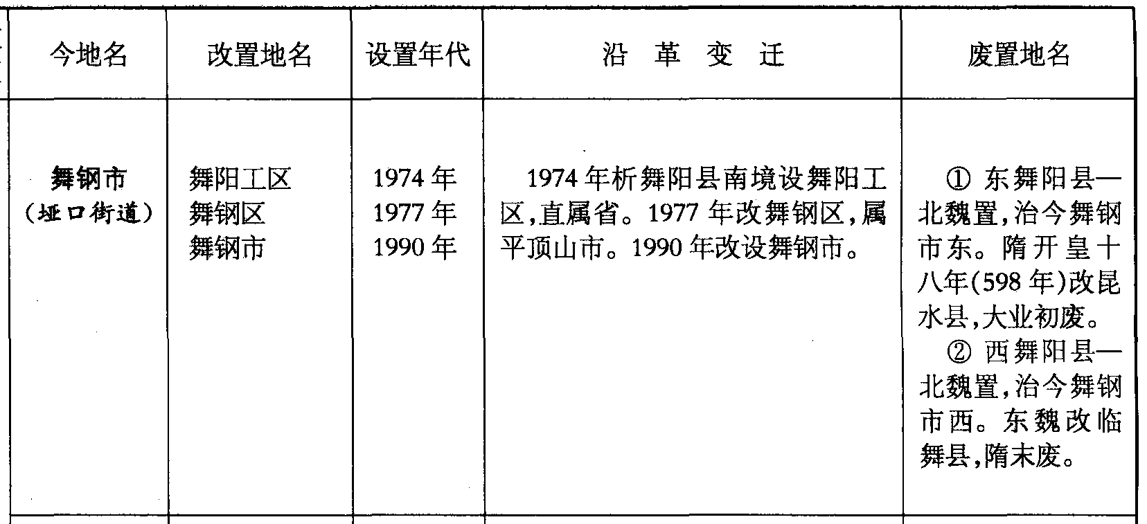 舞钢市(垭口街道)舞阳工区舞钢区舞钢市1974年1977年1990年1974年析舞阳县南境设舞阳工区,直属省。1977年改舞钢区,属平顶山市。1990年改设舞钢市。❶ 东舞阳县—北魏置,治今舞钢市东。隋开皇十八年(598年)改昆水县,大业初废。❷ 西舞阳县—北魏置,治今舞钢市西。东魏改临舞县,隋末废。