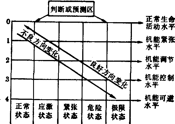 图1 不同功能状态下变异心率图 1.过度紧张 2. 紧张 3. 正常 4. 睡眠 5.过渡过程 航天员的身体健康状态和工作能力的判断或预测很重要。早期航天时,以诊断临床疾病为主。在多次航天实践后,认识到航天时人体反应是一种生理功能范围内的适应性变化。因此,在临床诊断的基础上,对人体功能状态进行判断或预测是医学监督的主要目的。航天中人体功能状态划分为三类;即:“正常”、“过度”和“危险”三类。为了达到正确区分各种状态; 首先应了解各主要应激因素的作用,特别是失重对机体的作用。一般地说,航天最初阶段以精神紧张为主,中晚期常表现为前庭-心血管系统功能状态的障碍。其次必须制定区分这些状态的指标的动态变化标准。对于人体功能状态预测,有二个途径:一种是医学专家的直观判断,采用外推法预测。缺点是受信息多及其复杂性的限制; 另一种是建立航天因素作用下的人体健康状态的数学模型,优点是快速准确。采用数学模型预测人体状态、应该立足于机体功能系统的调节理论,重点放在人体的适应性和机体的储备功能上。对于人体功能状态的判断和预测水平应该根据生物控制论的理论,把判断和预测放在机体功能控制水平以内,以紧张或危险状态为界限,根据这种思想提出了判断和预测区图。
