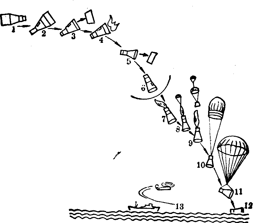 1. 入轨 2. 将飞船方位调整到制动火箭点火姿态3. 设备舱分离 4. 制动火箭点火 5. 制动火箭舱同座舱分离并将座舱调整到再入姿态 6. 再入制动开始 7. 减速伞打开(15250米) 8. 引导伞打开(3233米) 9. 交会舱和再入控制舱抛走,主伞打开10. 主伞完全张开(3000米) 11. 座舱两点悬挂12. 着水,主伞抛掉 13. 回收