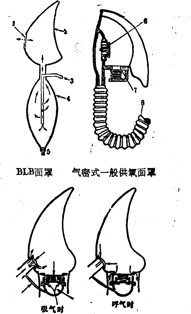 加压供氧面罩 图1 航空供氧面罩 1. 渗气盘 2. 面罩 3.进气管 4.贮气囊 5.放水塞6. 吸气活门 7. 呼气活门 8. 波纹软管 断续供氧系统 又称“需求式供氧系统”。是为克服上述连续型系统的缺点而研制的。以后为保证在各种高度均能提供符合生理要求的混合气体,而不是纯氧,又在调节器上安装空气混合机构(供氧成份调节机构),可随高度变化而自动调节所供气体的含氧比例。这样不仅可以节省氧气,还可避免氧浓度过高所带来的一些不利影响。因此,本系统具有以下特点:吸气时能适应使用者肺通气量变化,自动供给符合生理要求、含有一定比例氧的混合气体;呼气时则自动中止供气。由于采用气密式面罩,当调节器供纯氧时,面罩内氧浓度可达到接近100%的程度,故其保证高度也相应提高,使用上限可达12km。由于具有上述优点,此系统目前仍为军用飞机所广泛采用。断续供氧系统主要由氧源、氧气调节器、供氧面罩及指示仪表、连接管路等组成。氧气调节器内装有“肺式活门”(见图2)。吸气时面罩内的压力下降即通过软管传递到调节器内腔,在膜片两侧造成压差,使膜片弯曲而打开控制供气的肺式活门。吸气动作愈深,肺式活门开得愈大,所供氧气量也即相应增多。呼气时,面罩及调节器内腔压力增高,活门关闭,气流被截断。故此种型式的氧气调节器又有“肺式调节器”之称。氧气调节器中的空气混合机构主要由真空膜盒、高度调节活门、吸入活门等组成。当氧气流从肺式活门经文氏管喷射出时,由于引起局部压力下降,遂吸入周围的大气空气而将氧气稀释。其稀释程度由真空膜盒根据座舱高度控制高度调节活门实现;高度愈高,活门开口愈小,直至完全关闭。故由调节器所供吸入气体的含氧浓度随座舱高度而增加,至10km附近已达纯氧程度。空气混合机构下方有空气开关钮,关闭后,外界空气即不能进入,此时,调节器只供纯氧。怀疑舱内出现有害气体或飞越染毒区或放射性物质污染区上空时,即可闭上开关钮,改吸纯氧。面罩为气密式的一般供氧面罩,装有两个单向活门,一为吸气活门,一为呼气活门(图1)。此系统存在下述缺点:如面罩戴得不妥贴,吸气时可将外界空气一并吸入(称“面罩渗气”),造成吸入气中氧浓度过分稀释,可导致严重缺氧,甚至酿成事故。为克服面罩渗气问题,目前普遍采用“安全压力”(也称“小余压”)方法。即座舱压力高度超过一定范围后,氧气调节器另设有专门机构(补加供氧机构)使面罩内的压力得以始终保持较座舱压力略高的水平(约高3mmHg)。这样,当面罩气密不完全时,只能向外漏气而不致发生向内渗气的现象。虽有一定浪费,安全性却大为提高。但仍应教育飞行人员在高空飞行中随时注意将供氧面罩戴妥。