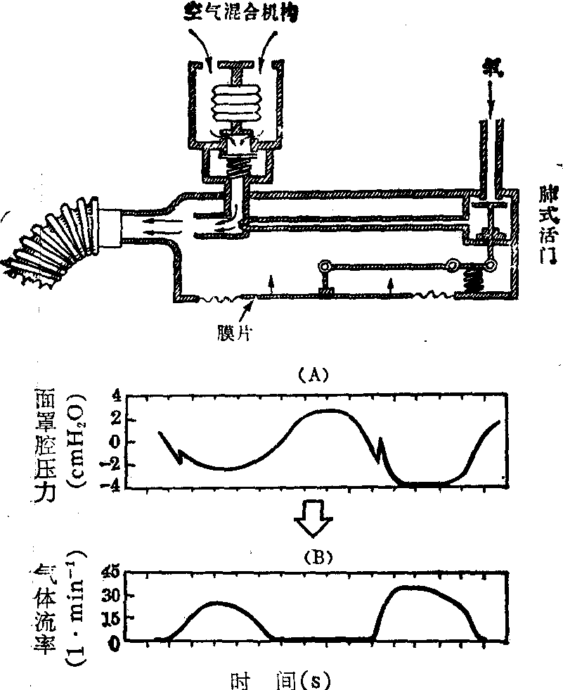 图2 断续供氧调节器的原理 上图为肺式调节器原理图;下图表明使用此种类型调节器时,(A)面罩腔内压力波动情况及(B)调节器输出气体流率变化。注意呼气时调节器气流即被截断 加压供氧系统 一般供氧系统的最大使用高度为12000m,长时间使用的允许高度在10000m以下。为防止12000m以上高度暴露所引起的极端严重缺氧,必须使用加压供氧系统,向使用者提供压力高出于周围环境的纯氧气流。其高出于座舱压力的值称为“余压”。此系统在供氧面具(供氧面罩与加压头盔的总称)腔内建立余压的原理大致如下:一方面采用连续供氧方式,以增大氧气供给量;另一方面,在面具呼气活门下方加设一机构,使之能随高度增加而不断提高呼气活门的阻力值(见图1,加压供氧面罩),以致面具腔内的气体压力必须超过呼气活门阻力时才可能被呼出。这样即可将吸入氧气的总压力值提高,使之超过环境压力。此种可增加呼气阻力的呼气活门也称“补偿式呼气活门”。暴露的高度愈高,所需的余压值也必愈高,故为达到预防缺氧的目的,即应采用总压力制度更高的加压供氧系统。但此种呼吸方式对人体生理功能影响颇大,一般只能短时间耐受余压值为30mmHg的加压呼吸。如欲提高此供氧系统的使用高度,必须对体表施加相应的对抗压力(或称“代偿压力”)。穿用加压背心向胸、背部体表施加对抗压力,可使余压值提高到40~45mmHg; 如对整个躯干体表加压,则余压可提高到60mmHg; 穿用部分加压服对除头、颈部以外的体表皆施加对抗压力,则可提高至75mmHg;将加压头盔与部分加压服配套使用,则可提高至145mmHg。如欲耐受更高的余压值,则需使用全加压服。根据以上原理,可设计不同总压力制度的加压供氧系统,而在各种总压力制度下又可采取多种配套方法,以满足不同机种和飞行任务的需要。我国现用加压供氧系统的总压力制度有三种:115mmHg(仅使用加压供氧面罩,如YX-32系统,使用终高度15km); 130mmHg(加压供氧面罩与侧管式部分加压服配套使用,如YX-2系统、YX-1A系统,使用终高度18km); 145mmHg(加压头盔与部分加压服配套,如YX-3系统、YX-1系统,使用终高度38km)。其他各国所用压力制度大体近似。在航空中,只是在增压座舱迅速减压后进行应急供氧时,才实行加压供氧;增压座舱完好时,仍应进行一般供氧。故军用飞机加压供氧系统在组成及配套上均较复杂。现对其主要部件种类及用途说明如下: 氧气调节器 增压座舱工作正常时,进行断续供氧,应具有肺式活门和空气混合机构等。空中发生座舱迅速减压时应能自动转为加压供氧。为此,应具有根据系统压力制度规定分别向供氧面具及防护服装以一定压力、流量及比例关系连续供给氧气的性能。再者,应有专门机构保证加压供氧的起始高度。以上由调节器的“余压调节机构”等实现。如使用侧管式部分加压服配套供氧,调节器内还应设有“加压程序控制机构”,以严格控制面具卸压以及对服装和面具加压的顺序,保护肺部免受机械性损伤。此类调节器以往多安装于仪表板上(“板装式”),其缺点是管路太长,以致吸气阻力增大和应急防护性能差等。目前又相继研制了“椅装式调节器” (安装于弹射座椅左侧的断接器上)以及微型化的“胸佩式调节器”(配于胸前)和“盔装式调节器”(装在面具上)等,均处于发展阶段中。 加压服 可对体表施加对抗压力以减轻加压呼吸不良影响的飞行防护服装称“加压服”,有“全加压服”与“部分加压服”之分。全加压服又称“密闭服”,系通过向服装内充以具有一定余压的气体而对全体表施加均匀气体对抗压力(已相当于个人用“微型增压舱”)。穿用此种服装可长时间在极低气压环境中停留,并能对多种环境因素的危害作用进行防护。但由于造价昂贵、结构复杂、肢体活动不便、影响操纵等原因,故航空中仅在驾驶高空侦察机、海军飞机等特殊条件下曾经使用。航天中用的“航天服”即在此基础上研制成功(见“航天服”)。