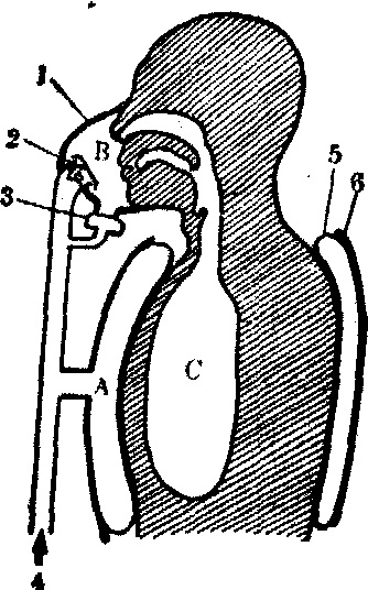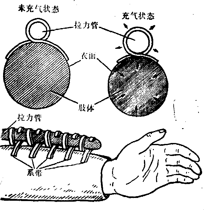 图4 囊式部分加压服原理图 A-气囊腔 B-面罩腔 C-肺1. 面罩 2. 吸气活门 3.呼气活门 4. 来自氧气调节器 5. 气囊 6. 限制层 为解决航空中常遇到的短时间高空防护问题,并满足平时穿用较方便的要求,已研制成功“部分加压服”。其原理为通过某种充气机构将服装拉紧,从而对体表施加机械性对抗压力。根据加压机构原理,可将其分为“侧管式”和“囊式”两种。“侧管式部分加压服”又称“高空代偿服”。如国产“DC-3高空代偿服” 即是。此类服装设有专门张紧装置,利用“绞盘”原理加压。在服装两侧,自上肢起沿躯干至下肢各有一纵向走行的橡胶拉力管,管和服装用“8”字型系带连接;当拉力管因充气而膨胀时,即可通过被绷紧的系带而将衣面拉紧对体表加压。身体所受压力与拉力管内压力成正比例关系,后者又由氧气调节器等机构调节,与面具内腔压力保持一定比例关系。这样,对体表施加的机械压力即可按面具腔内余压值大小进行自动调节。此类服装的优点是: 拉力管不充气时,肢体活动很少受限制,拉力管位于身体两侧,故服装通风性能较好。但这类服装有加压不均匀的缺点,如对腋窝、肩胛窝、腹股沟等部位无法加压; 且加压效果又与服装是否合体及调带质量等有很大关系。“囊式部分加压服”简称“囊式服装”,由服装内外约束层所包覆的平面气囊构成。气囊覆盖于整个躯干及其它加压部位(应注意对疝孔部位的保护)。气囊与氧气调节器出口、面罩或盔腔相连通(图4)。向气囊内充气时,膨胀的气囊即对直接覆盖的体表施加与囊内压相同的均匀压力,而未被覆盖部位则由被拉紧的衣面施加机械压力。当气囊对身体的覆盖角大于180°时,体表各处所受压力基本等于囊内压。此类服装的优点是: 加压均匀;呼吸功能得到显著改善,呼吸疲劳程度减轻; 座舱发生迅速减压时,能自动提供胸部体表代偿压力保护肺部不致受到气压性损伤; 氧气系统调节机构可大为简化,易于微型化; 穿脱较方便和对操纵动作影响较小等。此外,在弹射救生过程中,囊式服装的抗气流吹袭性能也较好。其缺点是:透气性差、热负荷大,在炎热地区使用需有通风服装配套。囊式部分加压服加压范围亦较广泛,对躯干及四肢体表皆能加压,如英国的MK-2联合部分加压服即是。但有的只能对躯干和上肢加压,称“带袖加压背心”,其腿部代偿压力则通过抗荷裤施加; 有的只对躯干加压,称“加压背心”。在一些使用高度较低、仅保证飞行员在座舱减压后能立即下降到安全高度的系统中,也可只穿着囊式“加压背心”(余压可达40mmHg),或在加压背心之外再利用抗荷裤气囊充压对下肢体表也同时施加对抗压力(余压可提高到70mmHg,使用终高度为18公里)。
