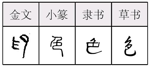 色 金文; 篆sè[⺈(刀,意符)+ 卩(人的跪跽形,意符,後訛變爲“巴”)→ 色(《説文》:“色,顔氣也。從人,從卩。”色,像置刀於跪跽者的一旁,以示殺戮,斷人身首。絕本字。借聲爲色彩〈顔色〉。風景〈景色〉,婦女的美貌〈姿色〉,金銀首飾中所含金銀的量〈成色〉。擬“色”與“絕”又有假借關係。)] 《詩經·大雅·皇矣》:“不大聲以色。”(從不大聲厲色。) 《論語·季氏》:“色思溫,貌思恭。”(臉色要溫和,容貌要恭敬。) 色(sè)“ ,颜气也。从人,从卪。凡色之属皆从色。 ,古文。”(所力切) 徐锴《系传》:“颜色,人之仪节也。” 色,春秋金文或左从爪,右从卪。战国文字于卪形下加短横,如信阳楚简作 ,郭店楚简作 。又郭店楚简或加页,如 、 。秦系文字睡虎地或讹作 ,或作 。许慎说从人从卪会意,大概意思说人的脸色表情应当是内心情绪的反映,如朱骏声云:“根心生色,若合符卪也。”段玉裁云:“颜气与心若合符卪,故其字从人、卪。”也有学者说色字当从人,卪当为声。张舜徽云:“人之颜气,见于容面,故古文从 ,从 犹从面耳。 与色,又双声也。颜气,犹言颜色、气色。”[1]“色”构意是脸色,如“察言观色”、“色厉内荏”、“谈虎色变”等中的“色”用的都是本义。 色部有两个属字。如“艴”字下云:“色艴如也。从色,弗声。《论语》曰:‘色艴如也。’” 色(6画) ❶sè ❷shǎi