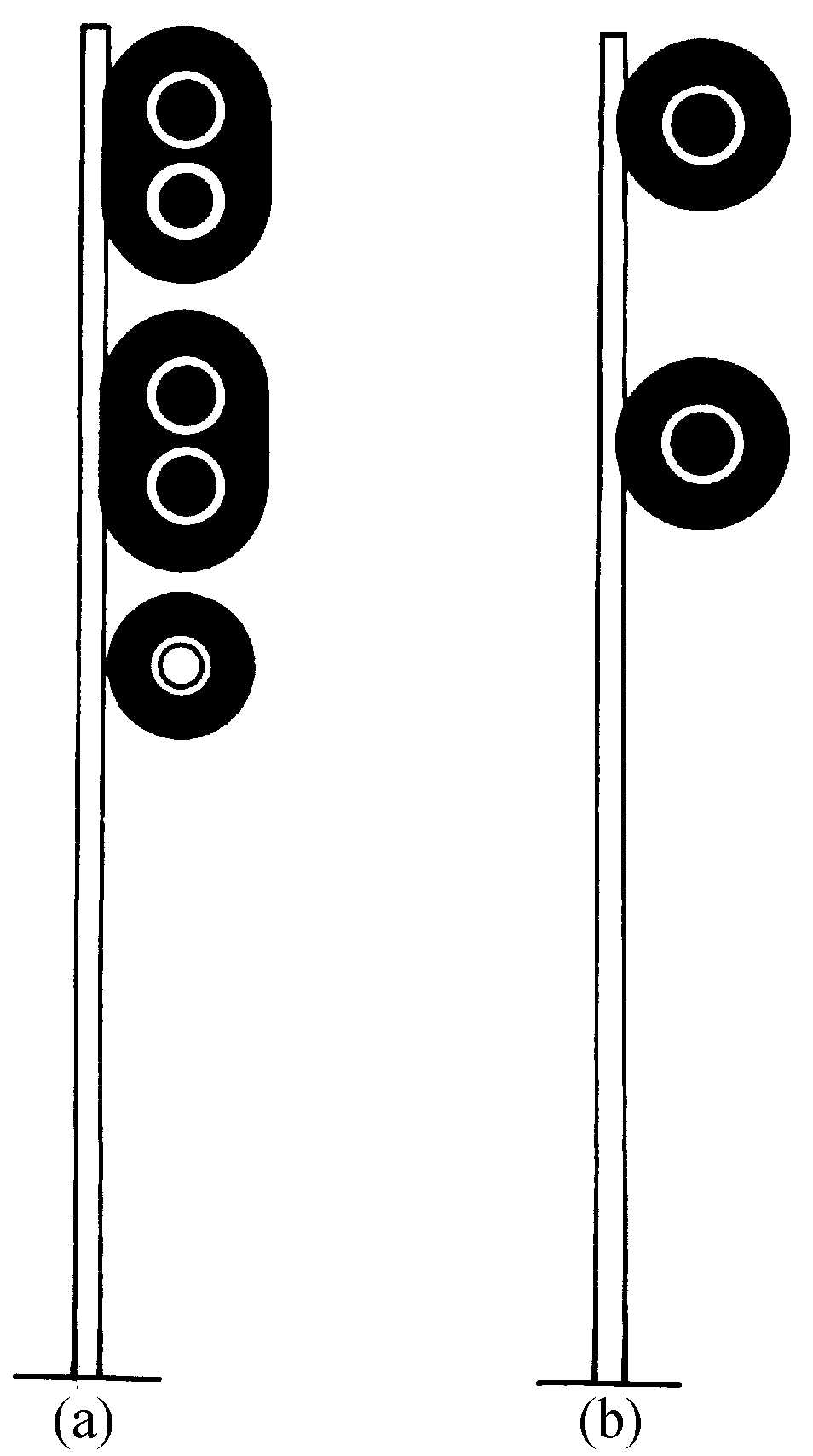 铁路利用灯光颜色、数目、亮灯状态(稳定灯光或闪光灯光)显示指挥行、调车作业命令的昼夜通用信号机。是铁路信号系统的重要组成部分之一。按信号灯具结构不同可分为透镜式和探照式两类。透镜式1个灯具只有1种颜色的灯光;探照式1个灯具可在3种不同颜色灯光之间变换。按安装灯具的信号机柱的长短不同又有高柱和矮柱两种。当受铁路限界限制时,灯具也可以安装在信号托架或信号桥上。按用途分有进站、出站、进路、通过、预告、容许、遮断、调车、驼峰等色灯信号机。通常以绿色和黄色灯光(调车为月白色灯光)给出允许运行信号;红色灯光(调车为蓝色灯光)给出停车信号。以进站高柱色灯信号机为例,配置结构如下图所示。图中(a)为透镜式,(b)为探照式。