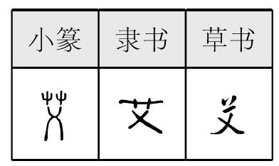 艾 甲骨文; 金文; 篆ài[艹(草,意符)+乂(聲符)→艾(《説文》:“艾,冰台也。從艸,乂聲。”艾,菊科植物,多年生草本。葉有香氣,乾燥後可加工爲艾絨,爲灸法治病的燃料。艾生長時“主莖獨秀”,引申爲美好少年〈少艾〉。艾,又作停止〈方興未艾〉。又因艾葉背面蒼白,古時用以尊稱老人。艾煙可以驅蚊蠅。段玉裁在《説文解字注》中引:“張華《博物志》:‘削冰令圓,舉以向日,以艾於後承其影,則得火。’”這段記載説明了中國人發明“聚焦取火”至少是在西晉〈公元266—316 年〉。)] 《詩經·王風·采葛》:“彼采艾兮。一日不見,如三歲兮。”(那人離家采艾葉,一日不見她的面,就像長隔整三年。) [春秋] 左丘明《左傳·襄公九年》:“不可以爭,大勞未艾。”(不要力戰以爭勝,大的勞作還在後頭。) 艾* (5画) ❶ài ❷yì