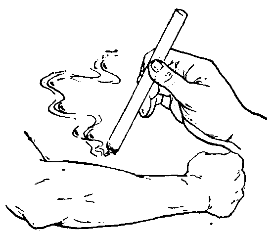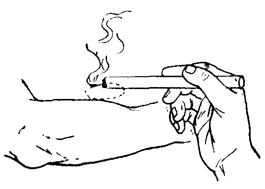 图2 温和灸 雀啄灸 以艾卷点燃端雀啄米样地熏烤穴位,忽高忽低,低者可使患者感觉灼痛,高者患者无明显感觉,一般灸5~10分钟。(图3) 熨热灸 也称巡回灸,多用于皮肤病的治疗,即在距离皮肤病疮面适当高度上巡回施灸,犹如熨烫衣服似的,直到皮肤病疮面上呈现红润为止。(图4)