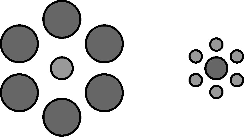 | 释义 | 艾宾浩斯错觉 艾宾浩斯错觉Ebbinghaus illusion大小错觉的一种。两个完全相同大小的物体,在一些比它大的物体中看上去显得小,而在一些比它小的物体中则显得大。德国心理学家艾宾浩斯提出,故称。