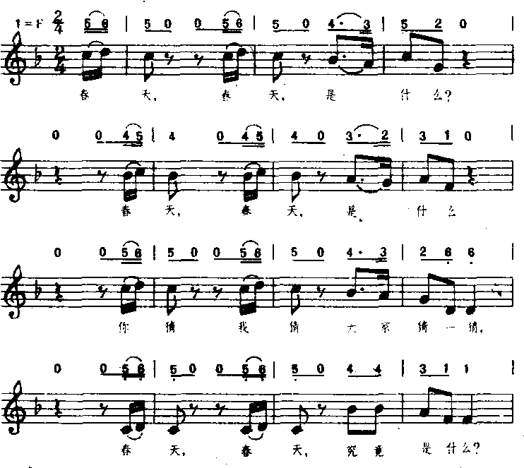 这些休止符不仅表现了活泼、轻快的情绪,而且有亲切的问话后热情地等待回答的感觉,给人以想象的空间。 ☚ 曲调节奏与歌词节奏的结合 节奏的布局 ☛ |