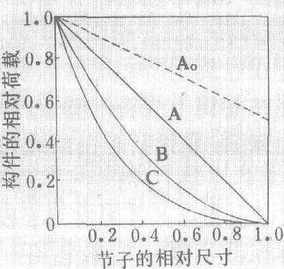 图2 节子相对尺寸对于构件相对荷载的关系 节子knot树木生长过程中隐生在树干内的枝桠基部。节子的存在破坏了木材纹理的通直性,影响木材的物理性质及力学性质,是木材的主要缺陷之一。根据节子的质地及其与周围木材相连的状况,可以分为活节、死节和漏节;根据节子的断面形状可以分为圆节、椭圆节、条状节和掌状节;根据节子的大小可以分为细节、小节、中节和大节;根据节子在材面上的位置可以分为材面节、边面节、暗节、连生节等。 |