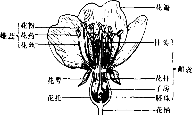 | 释义 | 花器flower part植物的生殖器官,也就是植物的花。它实际上是缩短了的变态枝,是植物果实种子形成的物质基础。一朵完全花由花柄(花梗)、花托、花萼、花冠、雄蕊、雌蕊和蜜腺等几个部分组成(图1)。花柄是着生在茎上的花的支持物。花托在花柄顶端,为花萼、花冠、雄蕊、雌蕊着生的部位,一般植物的花托实际就是枝顶端的扩大部分。有些植物的花托,在花萼至雌蕊之间的部分特别发达,能分泌蜜汁,形成花盘。例如橘的花盘,肥厚呈圆盘状,位于子房之下。牡丹的花盘,向上隆起将雌蕊基部包围起来。花萼和花冠总称花被。很多植物的花萼和花冠成为内外两轮,彼此分明,称重花被,如油菜、蚕豆、桃的花等;有些植物仅有花萼,称单被花,如桑、板栗的花等;完全不具备花被的,是无被花(裸花),如白杨、柳树的花。花萼是花的最外一轮或最下的一轮,通常由若干片组成,萼片大多呈绿色。萼片有合萼和离萼之分,萼片由于基部连合而成的部分叫萼筒,萼筒有各种形状,如管状萼、壶状萼、漏斗状萼和唇形萼等等。有些植物的萼筒延长呈管状的部分,称为距。萼片通常为一轮,也有二轮。二轮时外轮的萼片,称为副萼(也有人认为是苞片),如蔷薇科植物中的草莓花、锦葵科中的芙蓉花。花冠居花萼的第二轮,常呈鲜艳的颜色,并有香味,能招引蜜蜂等昆虫来采集,是花器中最显著的部分,由若干片组成;总称花冠,分称花瓣。花瓣或合或离,因此花也有合瓣花和离瓣花之分,在合瓣花的连合部分,称为花冠筒。花瓣表皮细胞里含有一种芳香的挥发油,使花有香味。花瓣的基部薄壁组织中的细胞液里含有一种叫花菁苷的色素,它能使花瓣显出红色、蓝色或紫色。花瓣的细胞中含有类胡萝卜素的有色体,细胞中的黄酮色素或黄色油滴,也能使花瓣呈现黄色或橘色。洁白颜色的花瓣是因为细胞中不含任何色素。花冠形状也因植物种类的不同而不同,常常作为分类上的依据。如十字花科的十字形花冠,豆科的蝶形花冠,旋花科的漏斗状花冠,桔梗科的钟状花冠,菊科的筒状花冠和舌状花冠,唇形科和玄参科的唇形花冠。花冠有整齐的,如十字形花冠;有不整齐的,如蝶形花冠和唇形花冠。