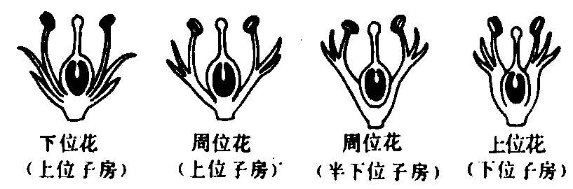 图2 植物子房的位置 同时具有雄蕊和雌蕊的花,称为两性花。雄蕊或雌蕊不完备或缺少其一的花,称为单性花。单性花的雄花和雌花都生在同一植株上,叫雌雄同株。若雄花和雌花分别在不同植株上,叫雌雄异株。如果在同一植株上既有两性花又有单性花,则叫杂性花。如果花中既无雌蕊,又无雄蕊,通常称为无性花,如向日葵边缘的舌状花。通常蜜腺分布在植物花的各个部分,用以招引蜜蜂、蝴蝶等昆虫采集花蜜。由于在长期的进化过程中,形成了植物的花器与蜜蜂等昆虫具有特殊的密切关系。蜜蜂等各种昆虫采集植物分泌的花蜜和植物的花粉作为自己的营养物质,使得自己的种族得以繁衍。而植物的花为了适应蜜蜂等昆虫采集,也有特殊构造适应蜜蜂采集活动和便于自己进行异花授粉。如玄参科的金鱼草和唇形科的鼠尾草的花器,为适应蜜蜂采集,都有很巧妙的构造。除花器的特殊构造外,花蜜、花的颜色和芳香,也都能招引蜜蜂等昆虫采集。 |