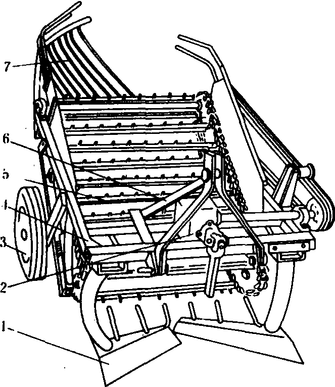 挖掘捡拾抖动型花生挖掘机 1.挖掘铲 2. 变速箱 3. 地轮 4. 机架 5. 升运链分离机构 6. 悬挂装置 7. 铺放滑条 花生收获机械用于花生的挖果、分离泥土、摘果、清选等过程的收获机具。20世纪40年代美国研制出花生分离—集条机,50~60年代研制出挖掘—翻转集条机。中国于50年代开始研究,60年代研制出摘果机、70年代研制出花生挖掘机,80年代初研制出花生联合收获机。有分段收获机械和联合收获机械2大类。主要有摘果机、挖掘机和联合收获机3种类型。 |