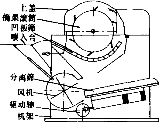 图1 挖掘捡拾抖动型花生挖掘机 1. 挖掘铲; 2. 变速箱; 3.地轮; 4. 机架;5. 升运链分离机构;6. 悬挂装置; 7. 铺放滑条 花生摘果机 由电动机或柴油机作配套动力固定在场上进行花生摘果与清选作业。主要结构一般由喂入台、摘果系统、分离筛、清选风机、机架与上盖等部分组成。摘果工作原理根据摘果系统结构型式不同分为钉齿打击摘果型与弹齿篦梳摘果型二种。钉齿打击摘果型的摘果系统一般由一个带固定钉齿的滚筒和栅格凹板组成,荚果由滚筒钉齿的撞击与摔打摘下。图2为钉齿打击摘果型花生摘果机,结构简单,制造容易,中国农村使用较多。弹齿篦梳摘果型的摘果系统是由多个滚筒凹板组组成,滚筒与凹板均固定有弹簧齿,荚果经滚筒动弹簧齿与凹板定弹簧齿篦梳作用而摘下。这种机型结构复杂,造价较高,但摘净率高,破碎率低,在美国应用较普遍。
