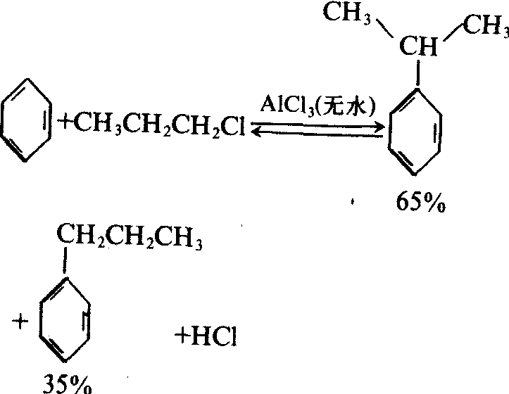 生成物烷基苯比苯更容易继续反应。因此,反应很难停留在一元取代上,得到的产物往往是混合物。若卤代烷的烷基是3个碳以上的直键,反应时常发生异构化。如: