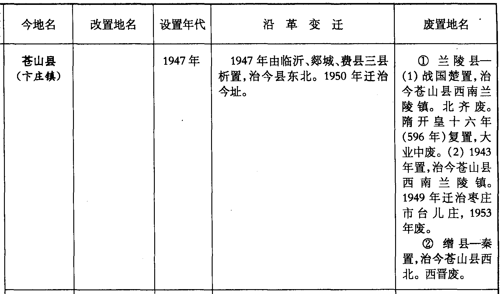 苍山县(卞庄镇)1947年1947年由临沂、郯城、费县三县析置,治今县东北。1950年迁治今址。❶ 兰陵县—(1)战国楚置,治今苍山县西南兰陵镇。北齐废。隋开皇十六年(596年)复置,大业中废。(2) 1943年置,治今苍山县西南兰陵镇。1949年迁治枣庄市台儿庄,1953年废。❷ 缯县—秦置,治今苍山县西北。西晋废。