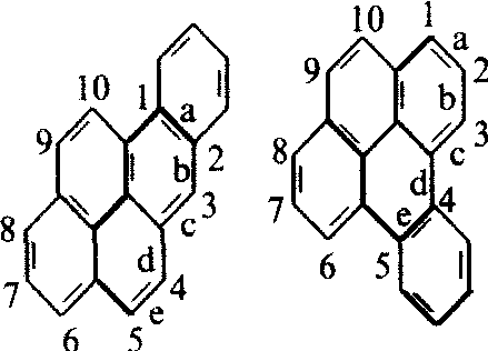 含5个环的稠环芳烃,分子式 C20H12。其中1,2-苯并芘 (苯并[α]芘) 为深黄色晶体,熔点为177.8℃; 最初由煤焦油中分离得到,从煤烟、焦油、沥青、香烟烟雾中都可以查出,有强烈的致癌作用,可以诱发肺癌,其在大气中的含量已经列入环境监测的常规项目。4,5-苯并芘 (苯并[e]芘) 是1,2-苯并芘的同分异构体,存在于煤烟和焦油中,也具有致癌作用。