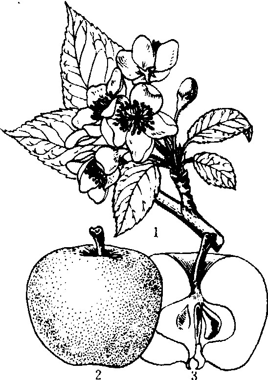 图 2 细纺锤形 病虫害防治 主要病虫害有腐烂病、褐斑病、炭疽病、早期落叶病、白粉病、苦痘病、轮纹病、缺铁黄化病, 食心虫类、螨类、金龟子类、卷叶蛾类、毛虫类、叶蝉、蚜虫等。防治方法: ❶发芽和开花前后, 剪除病虫梢, 刮治腐烂病, 发芽前喷5°石硫合剂, 花前防治金龟子; ❷夏季,5月中旬地面撒药防治食心虫, 5月中旬喷托布津防褐斑病、轮纹病,6月上旬喷杀螨剂和杀菌剂,6月下旬刮树皮喷2%福美砷防治腐烂病并食心虫和叶螨; ❸夏秋, 喷杀菌剂防治早期落叶病; ❹秋冬, 主干和大枝喷福美砷防腐烂病。 采收 果实采收过早, 产量明显降低,着色不良,风味低劣,贮藏性差,并易发生虎皮病等生理病害; 采收过迟, 果肉容易变绵, 水心病增多,贮藏力减弱,采前落果多, 降低产量和品质。采收适期一般是根据果实的色泽、硬度、风味、品质及种子颜色等来确定。红色品种果皮大部着色, 黄色品种果皮由绿变白或微黄时, 即达成熟期。因品种不同, 可采取分次采收或一次采收。一般用人工采收, 操作必须细致,带柄采下,轻拿轻放, 防止果实撞伤, 保证质量。 经济价值 果实含水分85%左右, 总糖量10~14.2%,苹果酸0.38~0.63%; 每100克果实含胡萝卜素0.64毫克, 硫胺素0.08毫克, 尼克酸0.8毫克,抗坏血酸40毫克, 脂肪0.8毫克, 碳水化合物122毫克, 蛋白质1.6克, 钙90毫克, 磷74毫克, 铁2.4毫克。都是人体健康所需的营养物质。除鲜食外,还可加工果汁、果酒、果脯、果干、果酱、果冻、蜜饯和罐头, 也可供烹调用。 苹果性味甘、凉,具有生津、润肺、开胃等功效。 苹果药名。出 《滇南本草》。又名柰、频婆。为蔷薇科植物苹果Malus pumila Mill的果实。我国东北、华北、华东等地广为栽培。味甘、酸,性凉。益胃,生津,除烦,醒酒。治脾虚泄泻,胃热口渴,暑热烦渴,食后腹胀,饮酒过度。内服: 生食、捣汁或熬膏服,或苹果干粉15g开水冲服。外治疮毒焮红,捣汁涂。主含碳水化合物,其中大部是糖,随品种而异。蔗糖约4%、还原糖6%~9%。又含酸约0.5%,主要为苹果酸 (Malic acid),还有奎宁酸、柠檬酸、酒石酸等。芳香成分中醇类占92%、羰类化合物占6%,尚有脂及酸。除去果胶的苹果注射液能升高血糖并有利尿作用。 苹果appleMalus pumila Mill.,蔷薇科,苹果属。落叶乔木。中国苹果和西洋苹果均属本种。广泛栽培的主要是西洋苹果,原产欧洲、中亚西亚。早在公元前3世纪,罗马和希腊已有栽培,现已成为世界上栽培最广的重要果树。品种近万个。中国渤海湾、黄河故道地区、秦岭北麓、西北、西南高地都是重要的苹果生产基地。苹果嫩枝和叶上常被茸毛。伞房花序,3~7朵,白色或淡红色。大多数品种自花不孕,需栽授粉树才能受粉。果实由子房和花托两部分发育而成。子房形成果心,花托形成果肉。果实呈扁圆、圆、圆锥、长圆等,大小各异,重70~250 g。熟时果皮黄绿或红色。2n=34,51,68。花期4~5月,成熟期夏季至秋末。喜光,较耐寒。主要用嫁接繁殖。 苹果蔷薇科落叶乔木,四川主要的栽培果树。凉山、甘孜、阿坝三州的大部分地区为集中产区,其中盐源、越西、茂汶、理县、汶川、小金、康定、丹巴、巴塘等县面积和产量最多。这些地区也是中国苹果的优质生态区。主栽品种有金冠 (又称黄元帅、黄香蕉)、红星、红冠、红富士、新红星等。另有近年新引进的早中熟新品种红津轻、红月、乔纳金等,表现良好,正在大面积推广。1994年全省苹果栽培总面积3.294万公顷,产量8.7645万吨。畅销省内外市场。 苹果林果业的主要作物之一。新疆的主要果品,被誉为“果中之王”。据有关记载,大约在汉唐时就有了广泛的种植。在伊犁地区的霍城县,古代就有阿力麻里城(意即苹果城),还有果子沟等地名;在新源和巩留两县,至今仍生长着约0.93万公顷的原始野果林。目前,苹果的主要产区依然是伊犁地区。主要品种有“新红星”、“黄元帅”、“红元帅”、“红富士”、“乔纳金”等。2002年,全区苹果种植面积3.04万公顷,总产量25.04万吨。其中,伊犁州苹果种植面积1.02万公顷,产量6.17万吨。此外,在阿克苏、喀什、和田等地也有广泛种植。 苹果蔷薇科苹果属落叶乔木。有35个种,主要分布亚洲、欧洲、美洲的北温带地区。中国有23种。分布全国,陕西、甘肃、四川省种类最多。原产于高加索以南、黑海与里海之间。中国栽培苹果于公元前2世纪的《上林赋》已有记载。中国栽培的西洋苹果最早于1870年引入。苹果株高3~5 m,根系分布于地下约4~6 m,花序有花3~7 朵,梨果。分布于最冷月平均气温-10~10℃地区。世界有8000多个品种,经济栽培品种约100个。苹果是世界上栽培最普遍、产量最多的果树之一。除供鲜食,还可加工果酒、果干。贮藏期长,便于远途运输。栽培的苹果又称西洋苹果,很多从国外引入,近年中国也选育出一批优良品种。同属植物供食用的有花红,又称沙果、林檎,果扁圆,果柄长。新疆野苹果,果实类型很多。海棠果果实圆或扁圆,北方用作鲜食或作糖葫芦等。同属植物山荆子是苹果优良砧木。海棠花、西府海棠、垂丝海棠等是重要园林绿化观赏树种。 苹果 苹果pingguoMaluspumila蔷薇科,苹果属。落叶乔木,幼枝、叶片、冬芽均有茸毛。伞房花序,具花3~7朵,集生于小枝顶端,花淡红或淡紫色。大多数品种自花不孕,需要种植授粉树。果实是梨果,由子房和花托共同发育而成。果呈圆、扁圆、长圆、椭圆等,形