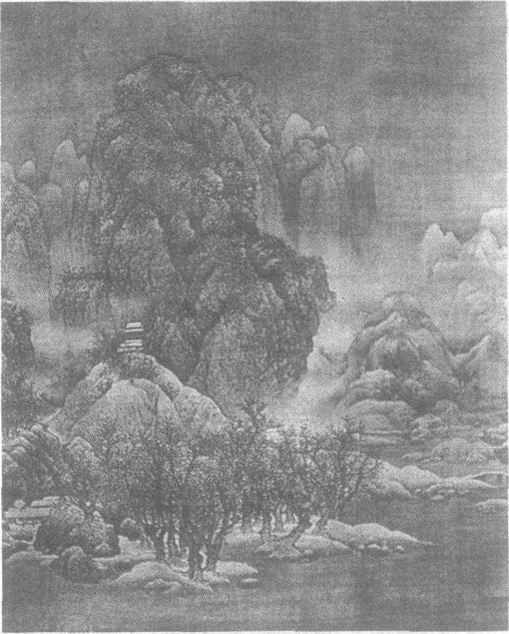 立轴,绢本,设色。图中群峰耸立,浑厚雄壮。近、中、远景层次分明。近景古树苍密,水面平静得无一丝波纹,主峰浑圆厚重,巍然屹立。峰顶密树寒林,点点簇簇,使山体更具深沉浑厚的体量感,且蕴含着勃勃生机。山中寺院或隐或现,山下几间积雪的白屋瓦楹,更觉山林的幽深静寂。两侧远山村落于云雪烟岚中苍茫一片,气象万千。同时衬托主峰更加崔嵬壮丽。此卷多描绘浑圆的山石,粗壮的林木,落笔雄健,用墨浓重。有的地方用淡墨层层积染。突出了北方山林宏伟威严的气势,又使画面浑厚滋润,不失典雅。