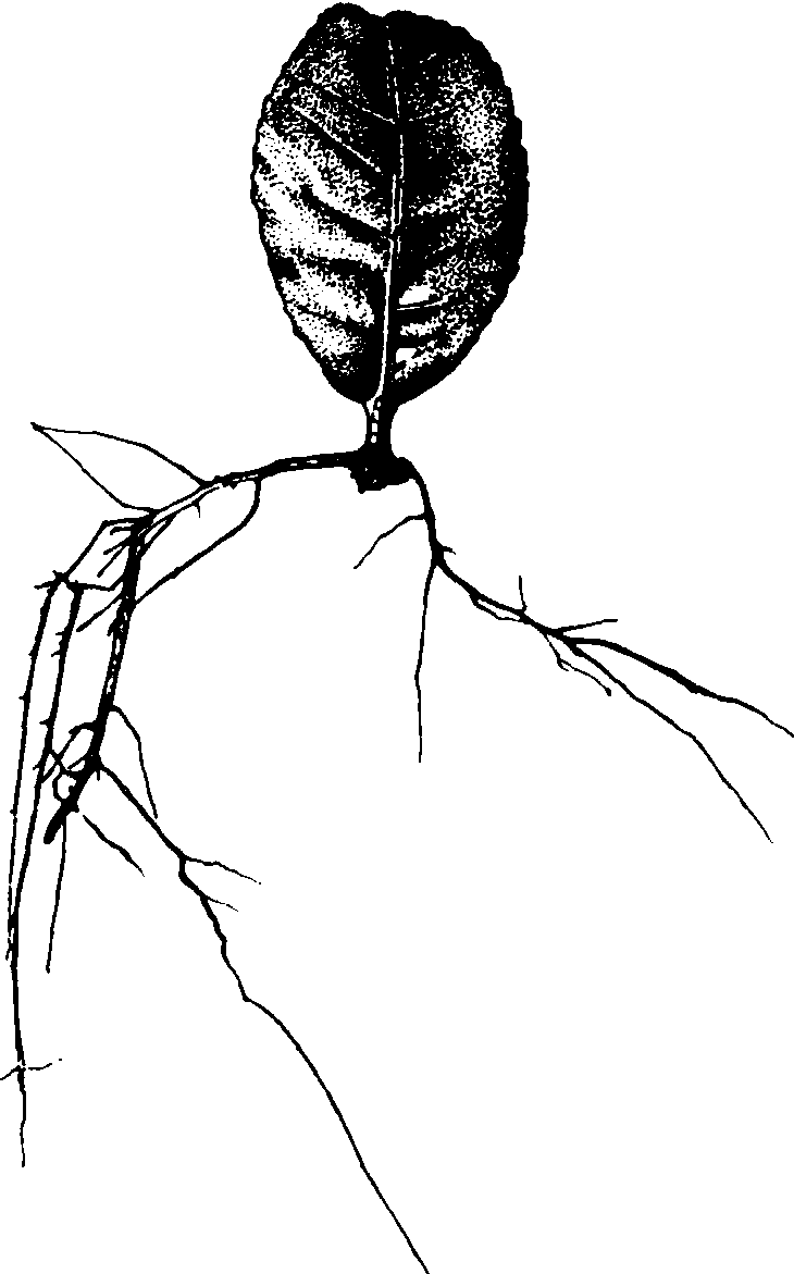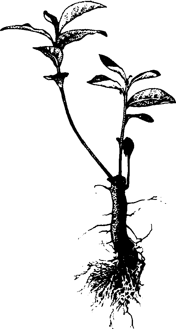 图5 标准插穗示意 扦插方法 在扦插当天,在已压平整的苗床上,按茶树品种叶片的长度,用划行器或7~10厘米宽的木板滚压出扦插行距的痕迹;然后浇水湿透表面心土层,待泥土稍干不沾手时, 开始扦插。扦插时, 用姆指和食指夹住插穗上端的腋芽和叶柄处, 沿行距痕迹将插穗斜插 (插穗剪口斜形) 或直插 (剪口平行) 入苗床土中。插穗的短茎约2/3插入土里, 露出叶柄和茶芽,防止叶片贴土而闭塞气孔, 造成叶片腐烂脱落。边插边用食指或中指将插穗附近的泥土稍加压实, 使插穗与泥土紧贴,利于吸收水分并使插穗固定在苗床上,叶片方向应向当季最多的风向, 顺风排列, 使插穗不会随风动摇。插穗的株距, 依茶树品种的叶片宽度而定,以叶片互不遮叠为适度; 扦插后,立即充分浇水,使插穗所达到的土层范围内全部湿透, 随后盖上遮荫物做好苗圃的管理工作(见茶树扦插苗圃)。 用营养钵进行扦插育苗, 便于培养壮苗, 提高移栽成活率, 便于劳力安排和定植成园快。其法采用稻草或塑料等材料先制作草泥营养钵或塑料营养钵。在扦插前将钵的中下层装上配制好的营养土稍加压实后,再填入3~4厘米的红黄壤心土并与钵面相平, 然后把插穗插在钵里。为提高营养钵的效率, 也可先将插穗插入苗床上待插穗愈合发根后,再带土移入营养钵中,插穗已长出的幼根仍要栽插在钵内的红黄壤心土中。扦插育苗的营养钵, 最好放置在靠近水源的地方。成畦的钵要在畦四周培上泥土,与钵面相平; 或把钵排置于平底沟里, 钵与钵之间的空隙, 用泥土填塞, 以保持营养钵的湿度。插好穗的钵, 随即在钵上设置遮荫棚、盖遮荫物或把钵放在树荫下,防止日晒而造成焦枯脱叶。 在扦插前, 将未经母株植物激素处理的插穗, 放在用50ppm的吲哚丁酸与50ppm的萘乙酸等体积混合配制好的药液里浸基部24小时后取出再插, 亦可将插穗的基部在500ppm的2,4-D或300ppm的增产灵的50%酒精溶液里以及在萘乙酸与吲哚丁酸的 500~1 000ppm的混合粉剂里蘸一下再插, 能促进插穗发根, 提高成活率。 扦插时期 按季节分为春、夏、秋和冬插。当春季茶芽开始膨大时便进行春插。此时, 除从养穗茶树上剪取插穗外, 还可以利用幼龄茶树定型修剪的枝条剪取插穗。春插的成活率一般没有夏、秋插高。中国的多数茶区在6~7月份进行夏插。夏季气温较高, 插穗的愈伤组织形成快, 成活率一般达80%以上。秋插多数在9~10月份进行, 成活率较高。冬季气候温暖的茶区, 从11月至翌年的1月份可进行冬插。在春、秋和冬季扦插, 全天都能进行,在高温烈日的夏季时,宜在上午10时以前和下午3时以后进行扦插。遇雨时,便不进行剪穗或将插穗贮藏待雨止时再剪或再插。 |
