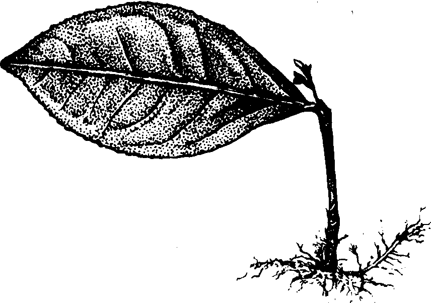 图4 根插 插穗剪取 从插条上剪取插穗的过程称为插穗剪取。当剪穗茶树的留养枝茎秆已半木质化、一般品种的枝条大部分已成红棕色、上部青枝条已硬化、中部腋芽有米粒大并且叶片已成熟的,便从鱼叶上留一、二片叶处剪取插条,剪取插穗以插条中部数节为最好,它们成熟度适中, 腋芽饱满,叶片大且营养物质贮藏多,较上、下部各节剪取的插穗发根抽芽快。剪取插穗时,通常从枝条的下端开始依次向上剪。普通的一叶短穗是剪下带有一个腋芽、一张完整健康叶片和一段短茎,长3~4厘米; 一般一个节间剪一短穗, 节间短的可剪一穗,将下端的叶片和腋芽剪去。剪口要与叶向相同,最好为斜面,上下端切口呈平行。插穗下端切口倾斜,增大接触面而易与土壤贴紧。插条上的腋芽已长成小枝的, 剪穗时将主枝留一叶, 小枝留基部的一片真叶进行剪取。剪口须平滑(图5)。剪穗时将花蕾摘除。最好在清晨及傍晚时随剪随插, 或在白天剪穗而在傍晚扦插。如不能立即扦插、可将剪好的插穗放在茶篮等器具里或摊放在荫湿的地上,避免风吹日晒和紧压,保持新鲜状态。贮放期间, 经常喷水并适时翻动, 以防因插穗的切口蒸发的水分大而影响扦插成活。在他地扦插, 用竹篓或炭篓把剪下的插条进行包装, 运输到达后, 再进行剪穗扦插。插条在运输途中, 喷水勿紧压, 力求维持插条的新鲜状态。在剪穗前3~5天用50ppm的2,4-D或30 ppm的增产灵等植物生长激素喷洒养穗母树, 使枝叶充分湿透,能促进插穗发根,提高成活率, 有利茶苗健壮生长。
