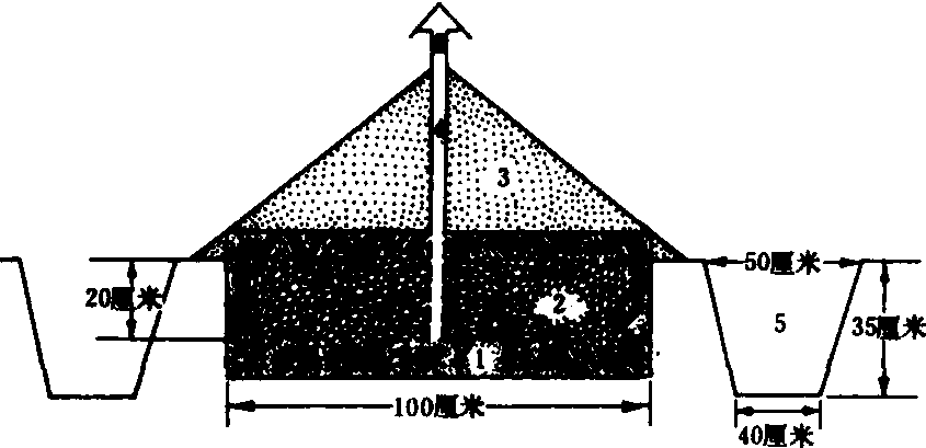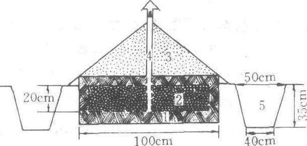 室外沟藏法横断面 1.沟内铺的干草或细沙 2.贮藏的茶籽 3. 铺在顶部的泥土 4. 通气竹管 5. 排水沟 |
