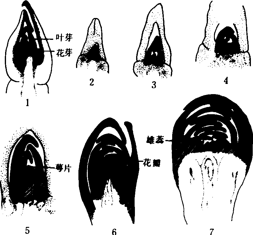 茶花芽分化过程 1. 腋芽纵剖面 2.二枚苞片出现 3. 第三枚苞片发生 4. 分化期 5. 萼片形成期 6. 花瓣形成期 7. 花蕾 茶花tea flower茶树的生殖器官。由茶树营养芽的鳞片腋间花芽发育而成,为两性花。在花轴上着生1~5朵花,假总状花序。花朵大的50~55 mm,小的20~25 mm,色白,极少数呈淡红色,光滑带革质。花萼呈覆瓦状排列,在花梗上不脱落,受粉后,保护子房。花冠由5~9片花瓣组成,上部分离,基部联合。雄蕊与花瓣基部结合,环列为2~3环,上端生花药,成“T”字形。雌蕊位于雄蕊的中央,由子房、花柱和柱头构成,子房3~4室,外被茸毛;子房上面是花柱,在一定高度处分成2~5个分叉(一般为3个),形成柱头。雌蕊有的比雄蕊高,有的比雄蕊低,随品种而异。茶树的顶芽不发育为花芽。