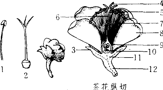 茶花的形态结构 1.雄蕊 2.雌蕊 3.花萼 4.柱头 5.花药 6.花柱 7.花丝 8.花瓣 9.子房 10.胚珠 11.花托 12.花柄 茶花山茶科山茶属观赏植物的总称。又名山茶花。山茶属约有200余种,中国约有185种。中国栽培茶花已有1000多年的历史。1739年之后,中国茶花传入西欧。用于观赏的茶花主要有4种:山茶、云南山茶、金花茶和茶梅。茶花为喜温喜湿植物,适宜生长温度15~25℃,适宜土壤pH值5.0~6.5。 茶花 茶花Chahua山茶科。又名山茶。常绿灌木或小乔木。叶倒卵形或椭圆形,有细锯齿,革质,互生,干后带黄色;叶柄长8—15毫米。花1—3朵生枝端或叶腋,白或红色;萼片5—6;花瓣5—6,或多数成重瓣;雄蕊多数;子房无毛。蒴果近球形,直径2. 2—3. 2厘米,3裂,观赏品类常不结实。我国华东、华南及日本原产,栽培品种达数百个。著名观赏植物,我国十大名花之一,以云南茶花为最著名。北方仅能栽培于温室;种子含油45%以上,食用或工业用;花为收敛止血药。