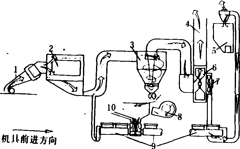 图1 气吸式草籽捡拾清选机 1.吸管式捡拾器; 2.脱粒器; 3.旋风分离器; 4.排气口; 5.清洁种子箱; 6.主输送装置风机; 7.种子输送装置风机; 8.筛选风机; 9.旋转筛; 10.筛箱 装捡拾器的草籽联合收获机 用于捡拾割倒风干的带籽牧草并进行脱粒清选的机械。和分段收获用谷物联合收割机相比,其特点是用弹齿带式来代替普通的弹性指转筒式捡拾器,利用由两组速度不同的胶带组成的脱粒装置来代替普通的滚筒式脱粒装置,分离清选部分包括逐稿器、两级气流分选器和一个立式旋转筛(图2),其脱净率高、破碎率低、清选质量好,适用于收获黑麦草、早熟禾、绛三叶、苜蓿等牧草种子。