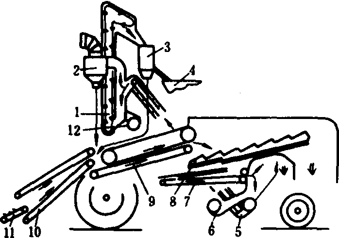 图2 装捡拾器的草籽联合收获机 1、5.升运器;2.旋风分离器; 3.立式旋转筛; 4.粮箱;6、12.风机; 7.输送器; 8.逐稿器;9.胶带脱粒装置;10.喂入装置; 11.弹齿带式捡拾器 中国的草籽生产尚不普遍,草籽收获机使用不广。随着草原改良和人工草场建设的发展,草籽收获机特别是装捡拾器的草籽联合收获机将得到相应的发展。 草籽收获机hay seed harvester收获牧草种子的机械。牧草种子的生物特性比较复杂,一般在植株上不成穗,生长位置不集中,成熟期不相同;有的种子成熟后落在地表层,且大部分种子几何尺寸小、重量轻,因而收获工艺有分段收获法、直接收获法、落地收获法等。多数采用经改装的谷物联合收割机分段收获,也有研制成专用的牧草种子收获机以收获落地的种子。由捡拾、脱粒、清选等部分组成。捡拾器采用气吸式,高度可调节,其他部分的工作原理与谷物联合收割机相同,只是改变工作参数,以适应草籽收获的需要。 |