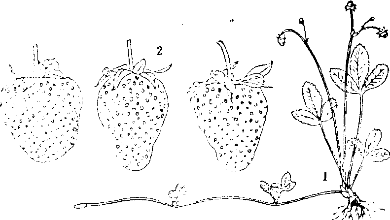 草莓在中国栽培历史较短,但南方、北方均有分布。20世纪80年代中期草莓栽培面积达2000公顷以上。 生物学特性 草莓品种不同, 但有共同的特征与特性。 特征和特性 草莓植株矮小,株高不超过30厘米。茎分新茎、根状茎和匍匐茎3种。❶新茎又称短缩茎,是草莓的当年生茎。加长生长缓慢,年生长量仅0.5~2厘米。节间极短,仅2毫米。新茎上轮生叶片、叶腋形成叶芽, 叶芽具早熟性, 当年多能萌发成匍匐茎或新茎分枝。 ❷根状茎是草莓的多年生茎,由于新茎上的叶陆续枯死后形成外形似根的茎, 是草莓的贮藏器官。 ❸匍匐茎是由新茎上的腋芽抽生的一种地上茎。每条匍匐茎都有2节: 第二节腋芽能发育成新茎, 新茎基部接触土壤后扎根形成一匍匐茎幼株; 第一节腋芽能继续抽生匍匐茎,同样也是第 二节形成匍匐茎幼株。第一节多为潜伏芽,有时也能抽生出侧生匍匐茎。1株草莓抽生匍匐茎形成各级匍匐茎幼株的数量, 因品种和栽培条件而异, 一般可形成25~200株。 叶为三出复叶, 着生于叶柄顶端。小叶倒卵圆形或菱状卵圆形, 先端有小水孔, 当土壤水分和养分适宜时, 清晨有小水珠附在叶尖, 形成溢泌现象, 可作为草莓发育和营养诊断的指标。叶柄长10~20厘米,密被黄色柔毛, 基部具托叶鞘,呈膜质状包于新茎上。 花序为聚伞花序或多歧聚伞花序。1花序有花约20朵, 花瓣白色, 萼片一直保持绿色宿存。多数品种为两性花, 自花结实、雄蕊多数, 大量的雌蕊离生于凸起的花托上; 少数品种雄蕊发育不全或无, 为雌能花或雌性花, 在配置两性花品种授粉时, 产量不低于两性花品种。夏末秋初新茎顶端形成花芽, 翌年春抽出花茎开花结果。 果实由花托肥大而成, 柔软多汁, 属浆果, 称聚花果。果面嵌生许多由子房发育芝麻粒状小瘦果, 通称种子。浆果红色、橙红色, 规则或不规则圆锥形、长圆锥形、近圆形等。果肉多红色、橙红色, 极个别白色微带红色。同一花序开花有先后,早开的花早结果,果也大, 以后结的果逐渐变小, 以至成为无效果。开花后约30天浆果成熟。浆果大小因品种而异, 大者可达50克以上(见图)。